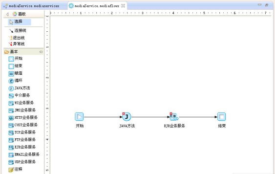 4.在"中介服务"编辑页面点击"服务编排"链接,进入编排中介服务的界面。在"选用板"中将"JAVA方法"和"JAVA业务服务"图元拖拽到右边的编辑区,并用"连接线"依次连接,如下图所示: