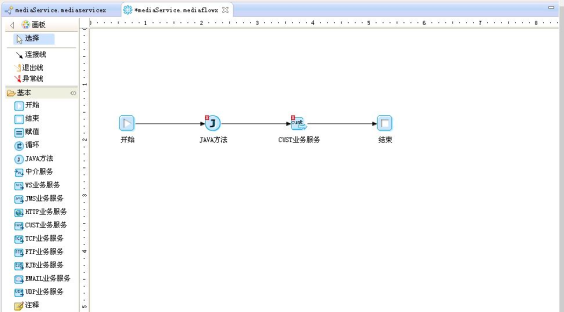4.在"中介服务"编辑页面点击"服务编排"链接,进入编排中介服务的界面。在"选用板"中将"JAVA方法"和"CUST业务服务"图元拖拽到右边的编辑区,并用"连接线"依次连接,如下图所示: