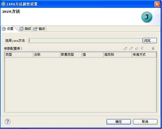 5.双击编辑区中的"Java方法"图元,弹出"JAVA方法属性设置"窗口,如下图所示: