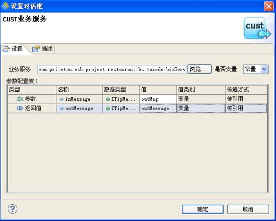8.双击编辑区中的"CUST业务服务"图元,弹出JMS业务服务的"设置对话框",点击"浏览..."按钮,选择刚创建的CUST业务服务。