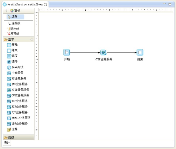 选中HTTP业务服务图元将此图元拖拽到编辑区,用连接线依次将开始、HTTP业务服务和结束三个图元连接起来,如下图所示: