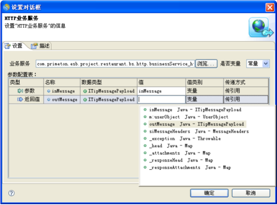 - 返回值:其名称为outMessage,该返回值是业务服务或者是子中介的返回值。