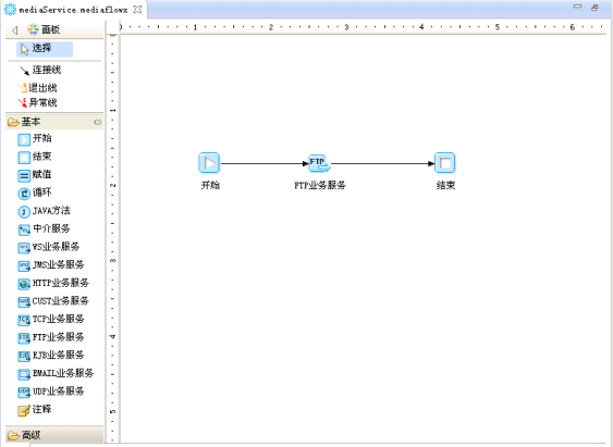选中FTP业务服务图元将此图元拖拽到编辑区,用连接线依次将开始、FTP业务服务和结束三个图元连接起来,如下图所示: