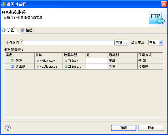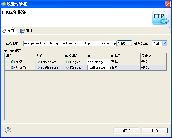 在"设置对话框"窗口中的参数配置表中输入参数和返回值,点击"确定"按钮完成FTP业务服务的参数设置,如下图所示:
