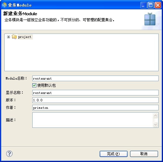 在"业务Module"向导中,输入业务Module的相关信息,点击"完成"按钮,创建业务Module,如下图所示。