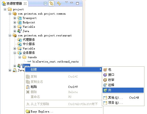 创建Java方法。在资源管理器中右键点击业务Module中的Java,选择"创建->类" 菜单项,如下图所示。