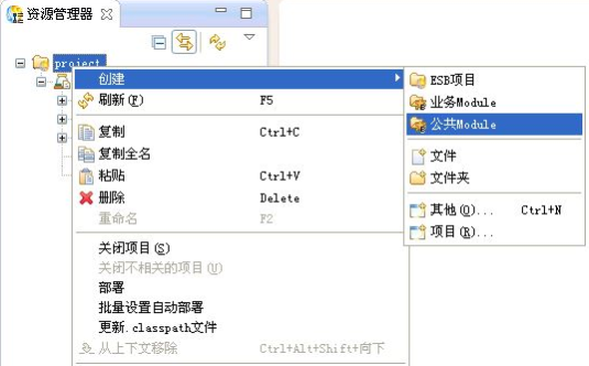 在资源管理器中,选中project,点击右键,选择"创建->公共Module"菜单项,创建公共Module,如下图所示。