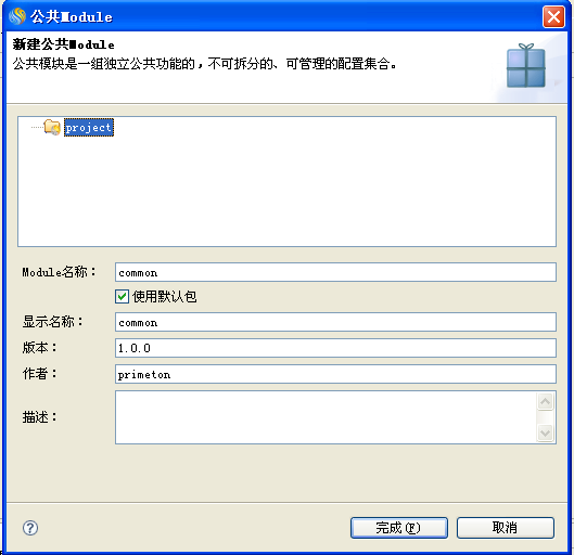 2.在"公共Module"向导中,输入公共Module的相关信息,点击"完成"按钮,创建公共Module,如下图所示。