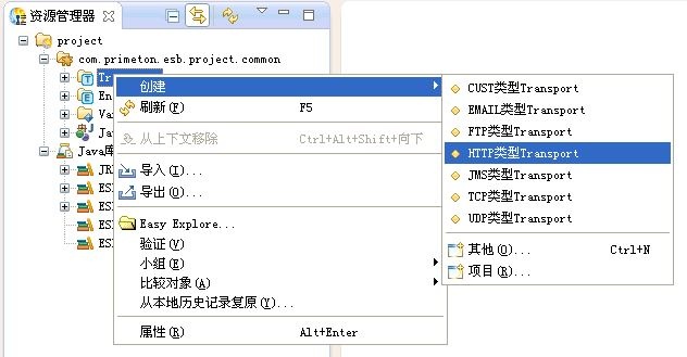 1.在资源管理器中,选中新建的公共Module中的"Transport",点击右键,选择"创建->Http类型Transport"菜单项,创建HttpTransport,如下图所示。