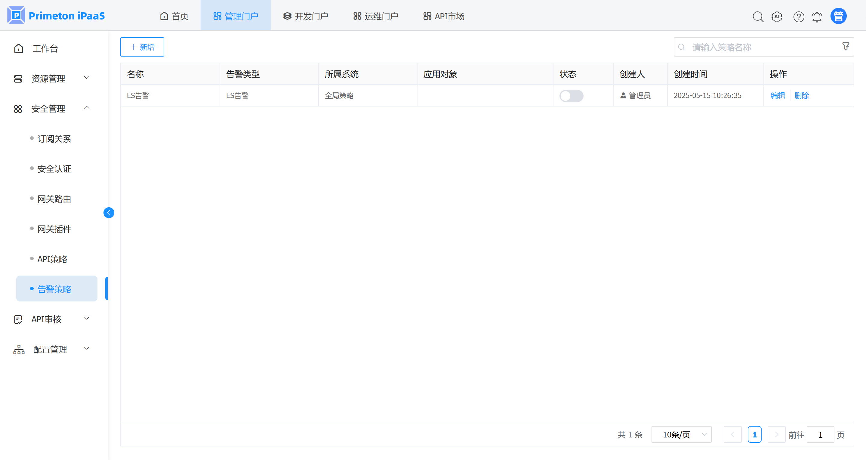 管理人员登录系统,进入管理门户,点击菜单“安全管理”>"告警策略“,进入告警策略页面。