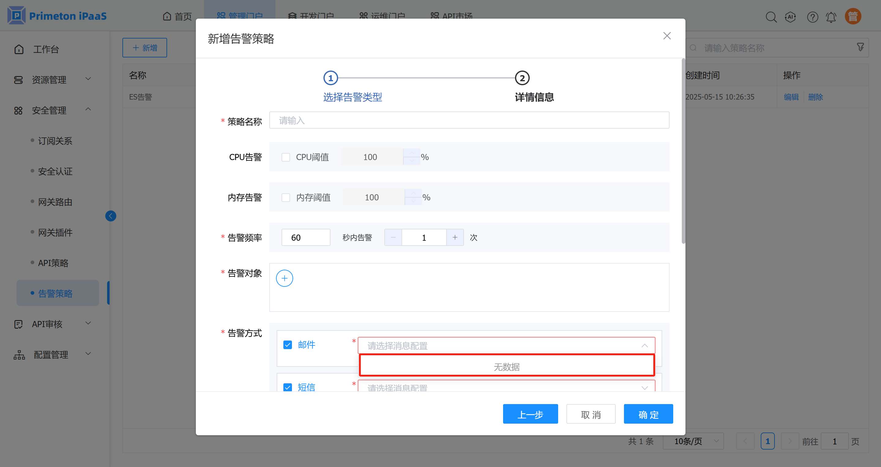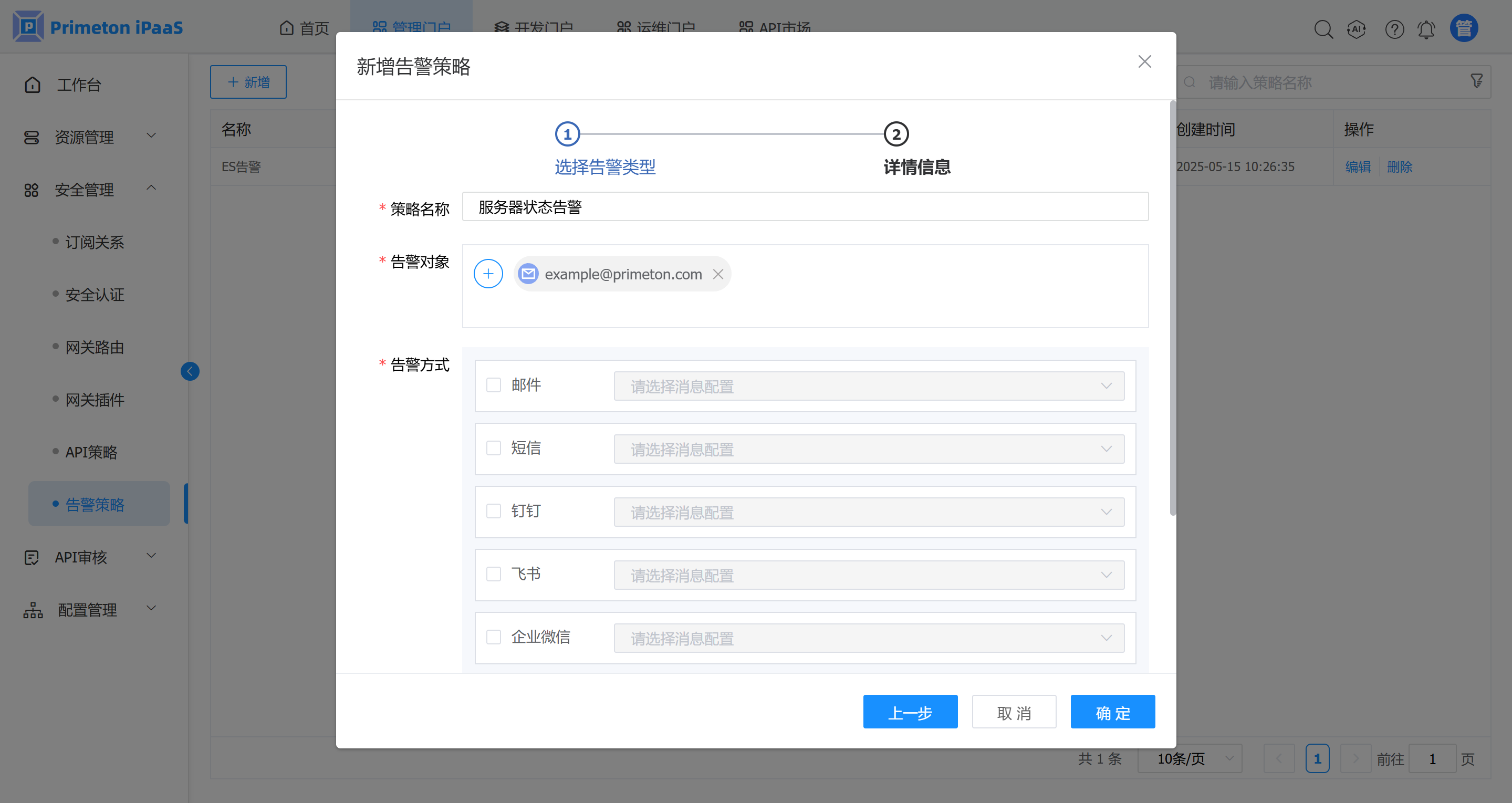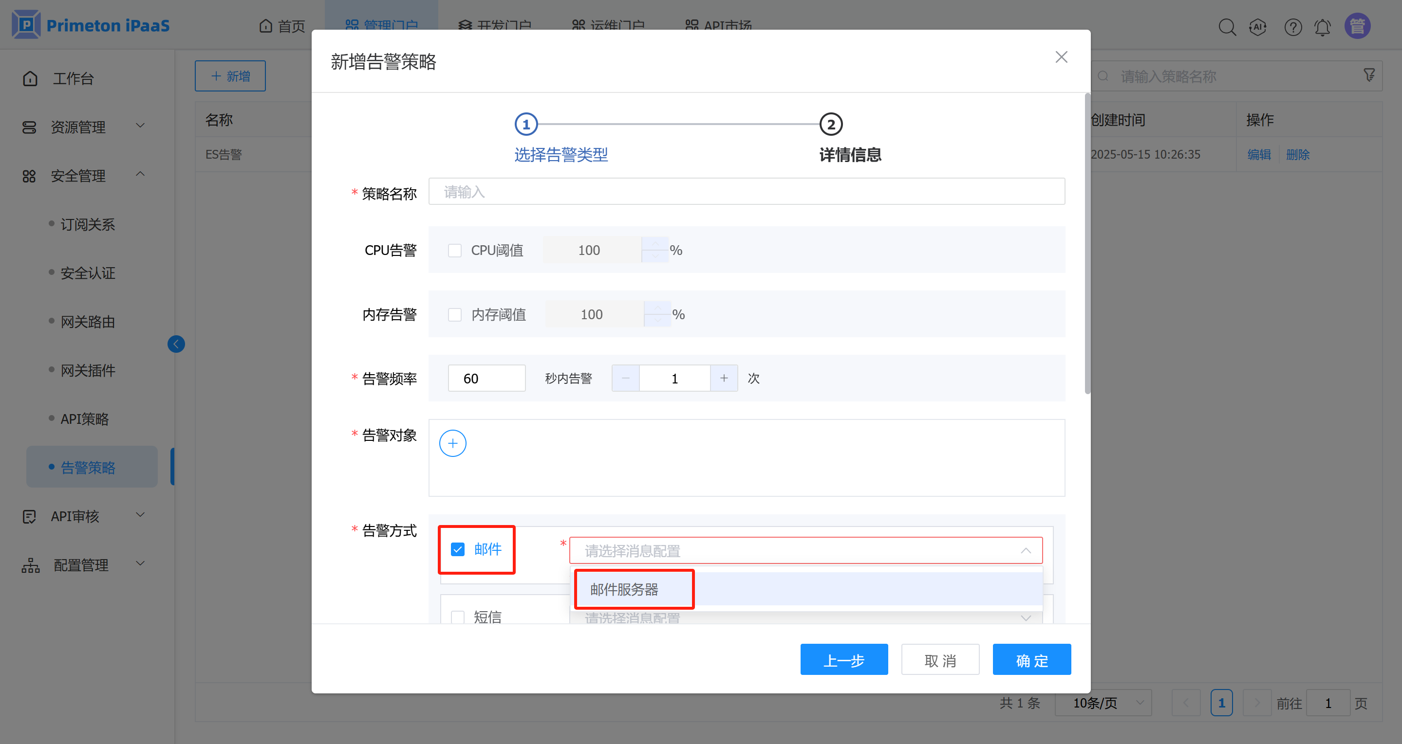 完成邮件配置后,管理人员登录系统,进入管理门户,点击菜单“安全管理”>"告警策略“,进入告警策略页面。点击“新增”按钮,选择“具体的告警类型”,点击下一步, 进入新增告警策略页面。即可选择刚才配置的邮件信息。
