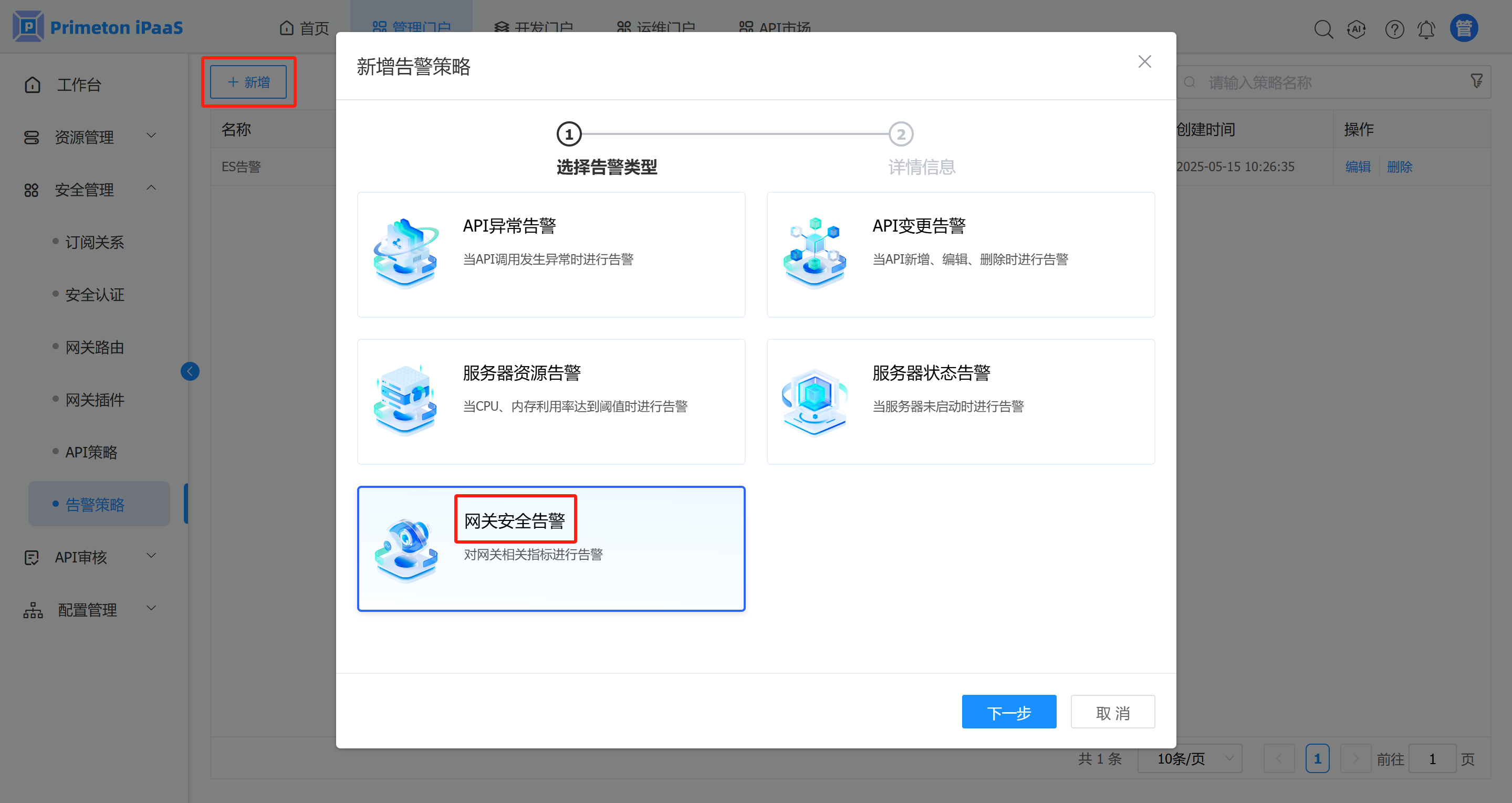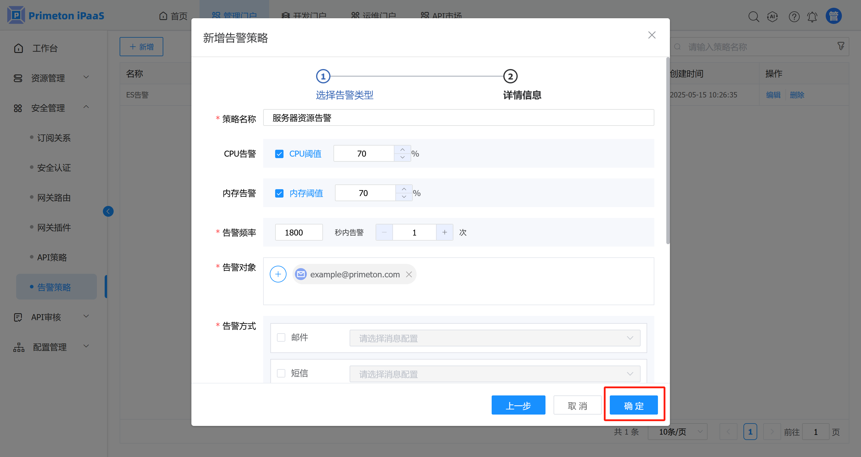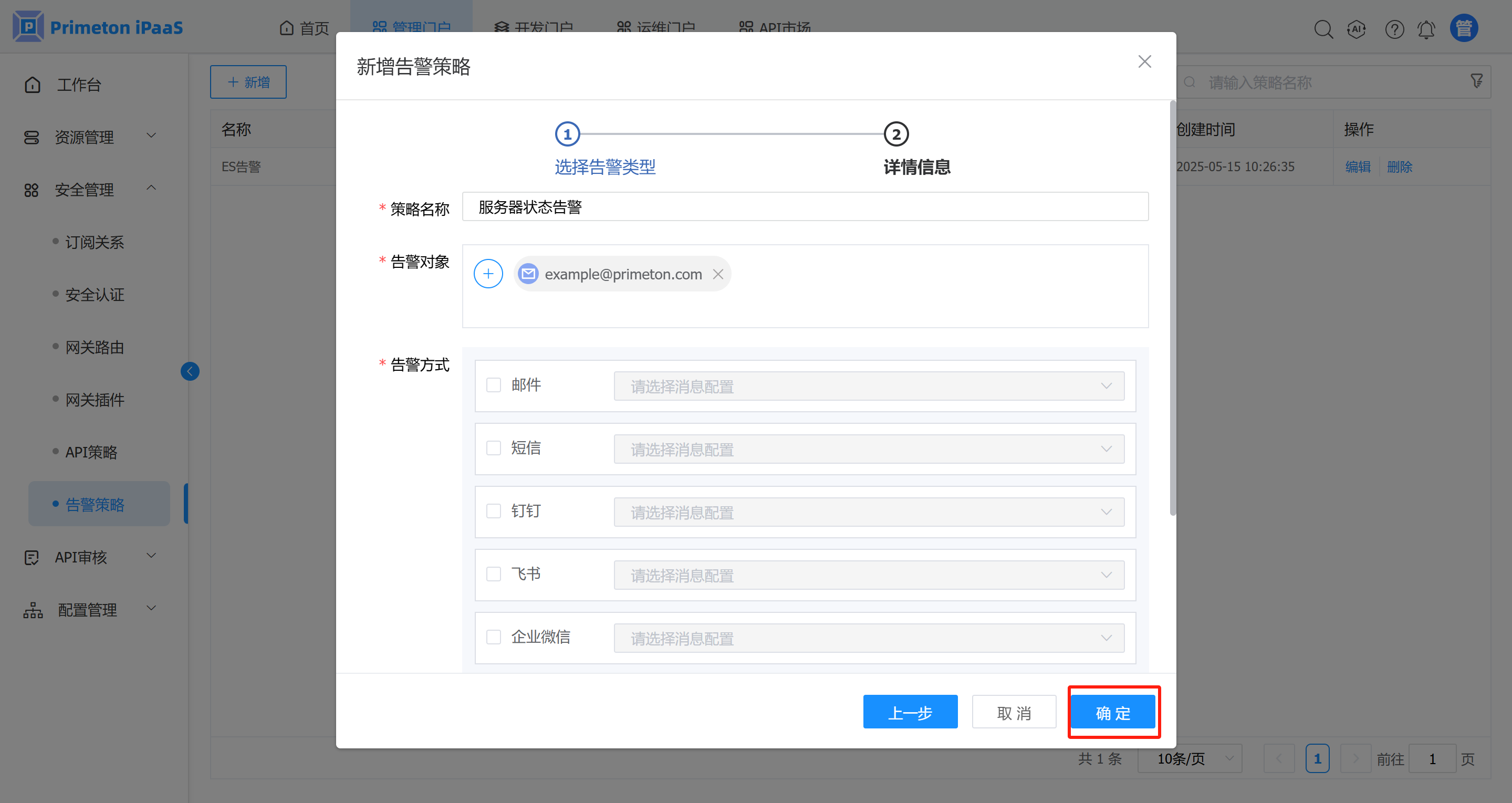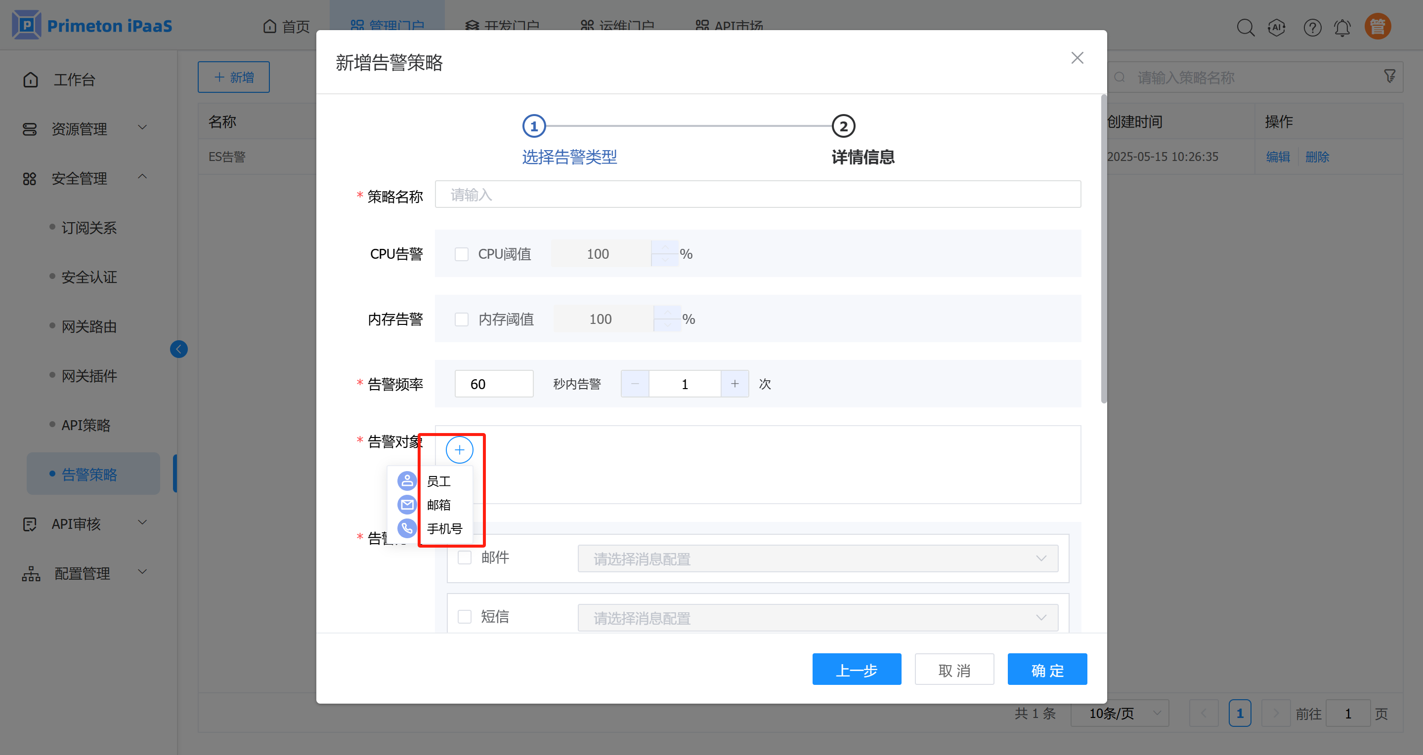 完成邮件配置后,管理人员登录系统,进入管理门户,点击菜单“安全管理”>"告警策略“,进入告警策略页面。点击“新增”按钮,选择“具体的告警类型”,点击下一步, 进入新增告警策略页面。即可选择刚才配置的邮件信息。