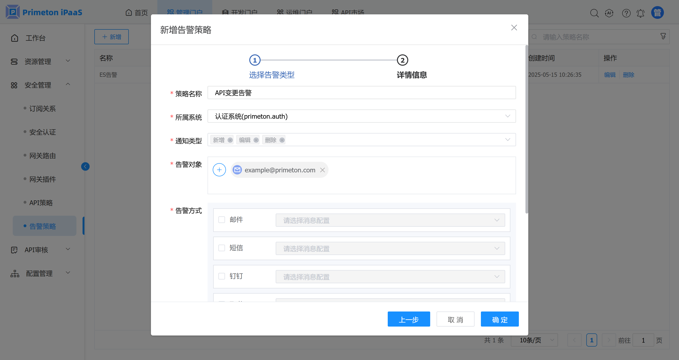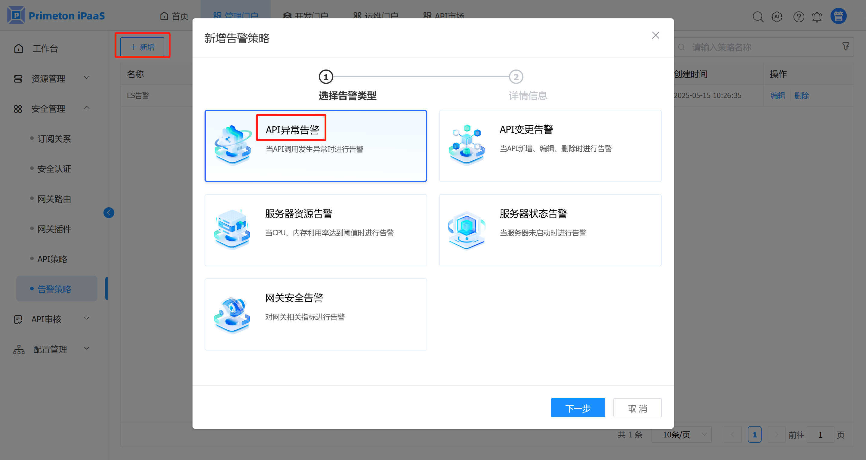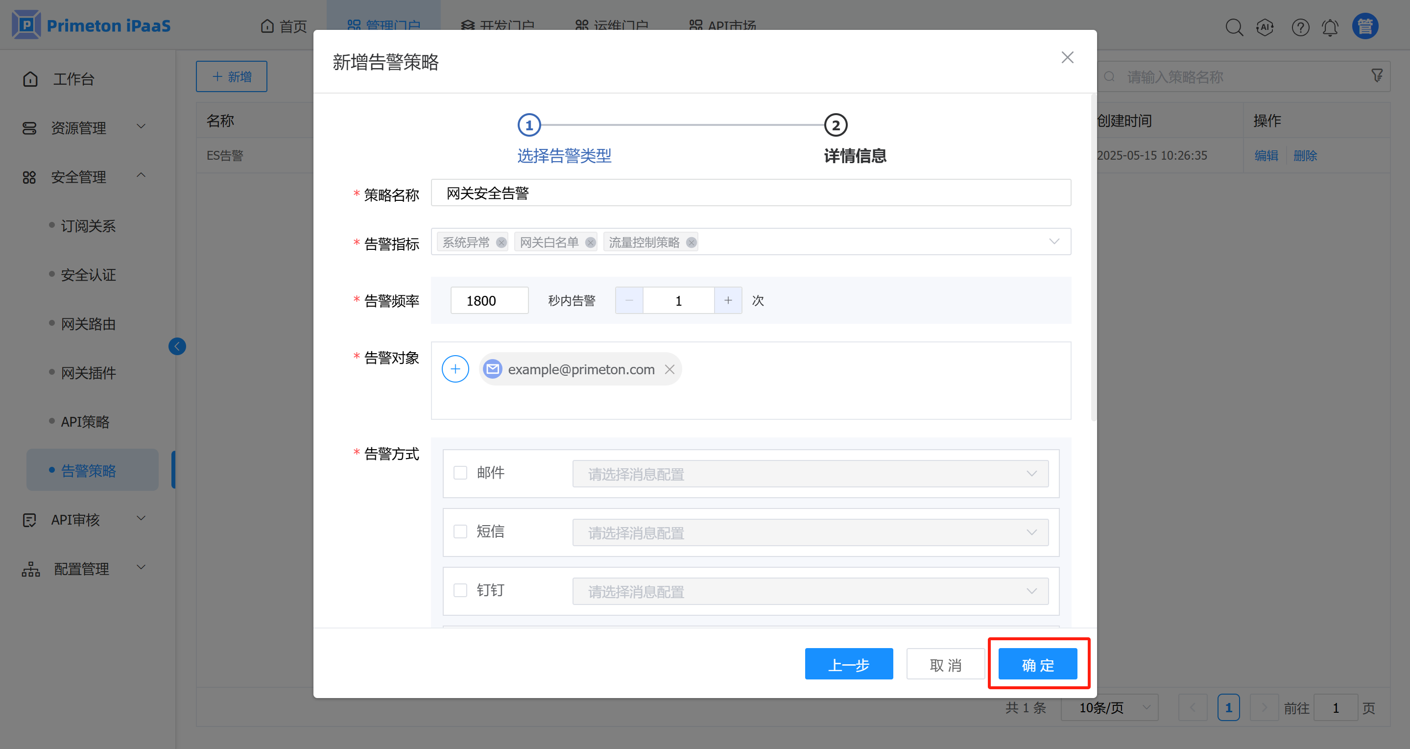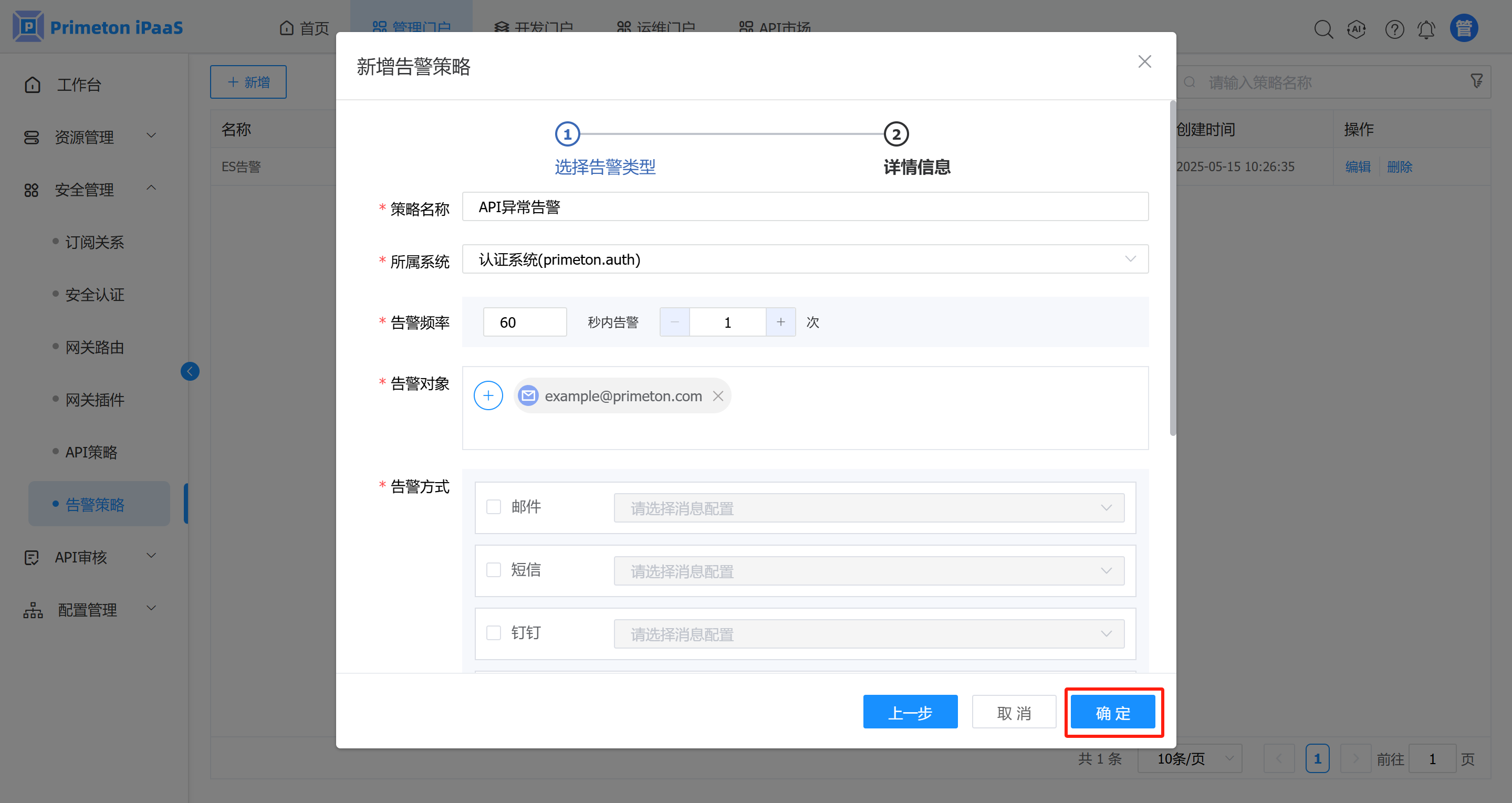 - API异常告警:当API出现异常时,触发告警,可指定告警频率、告警对象、告警方式等。