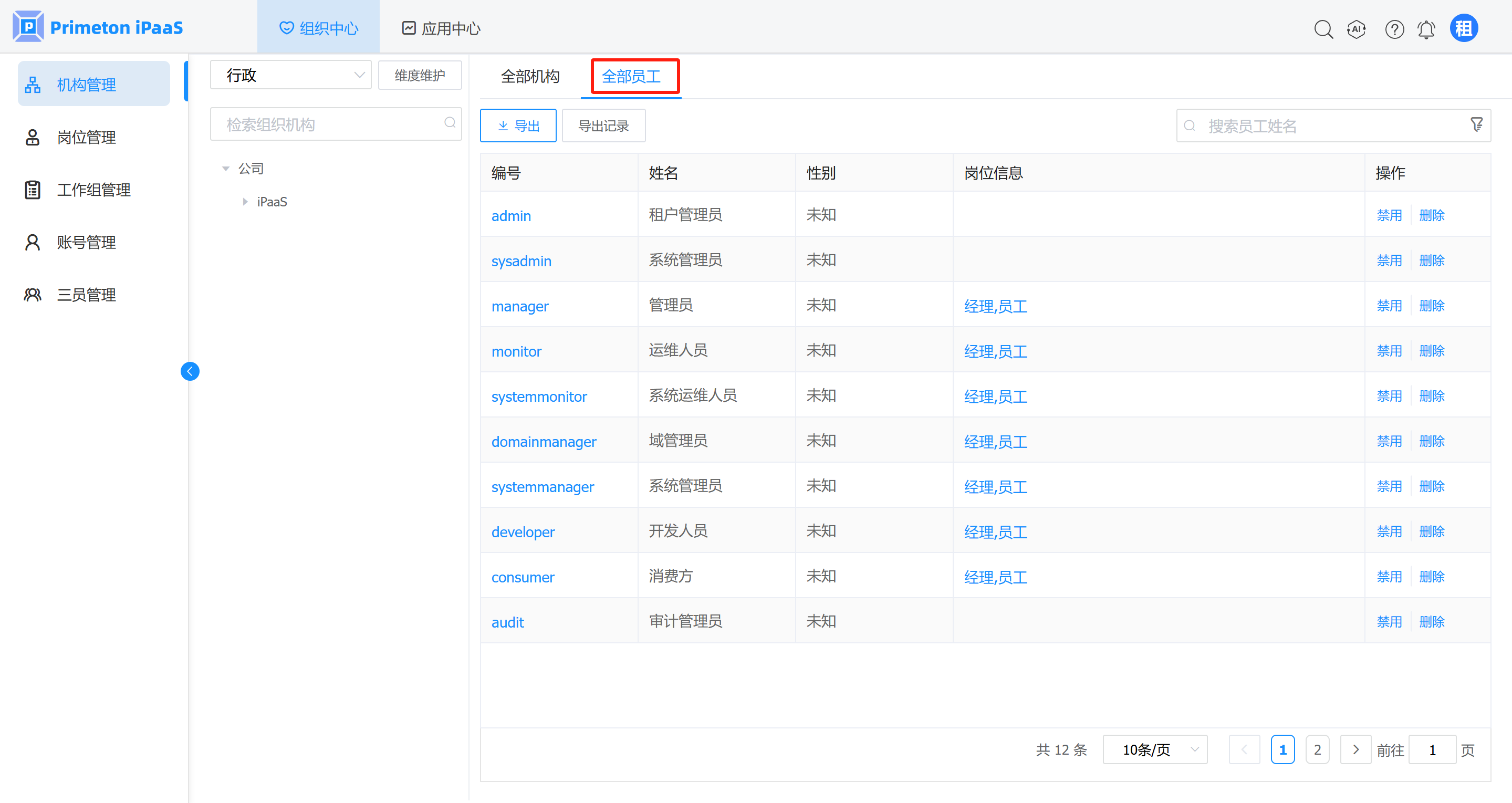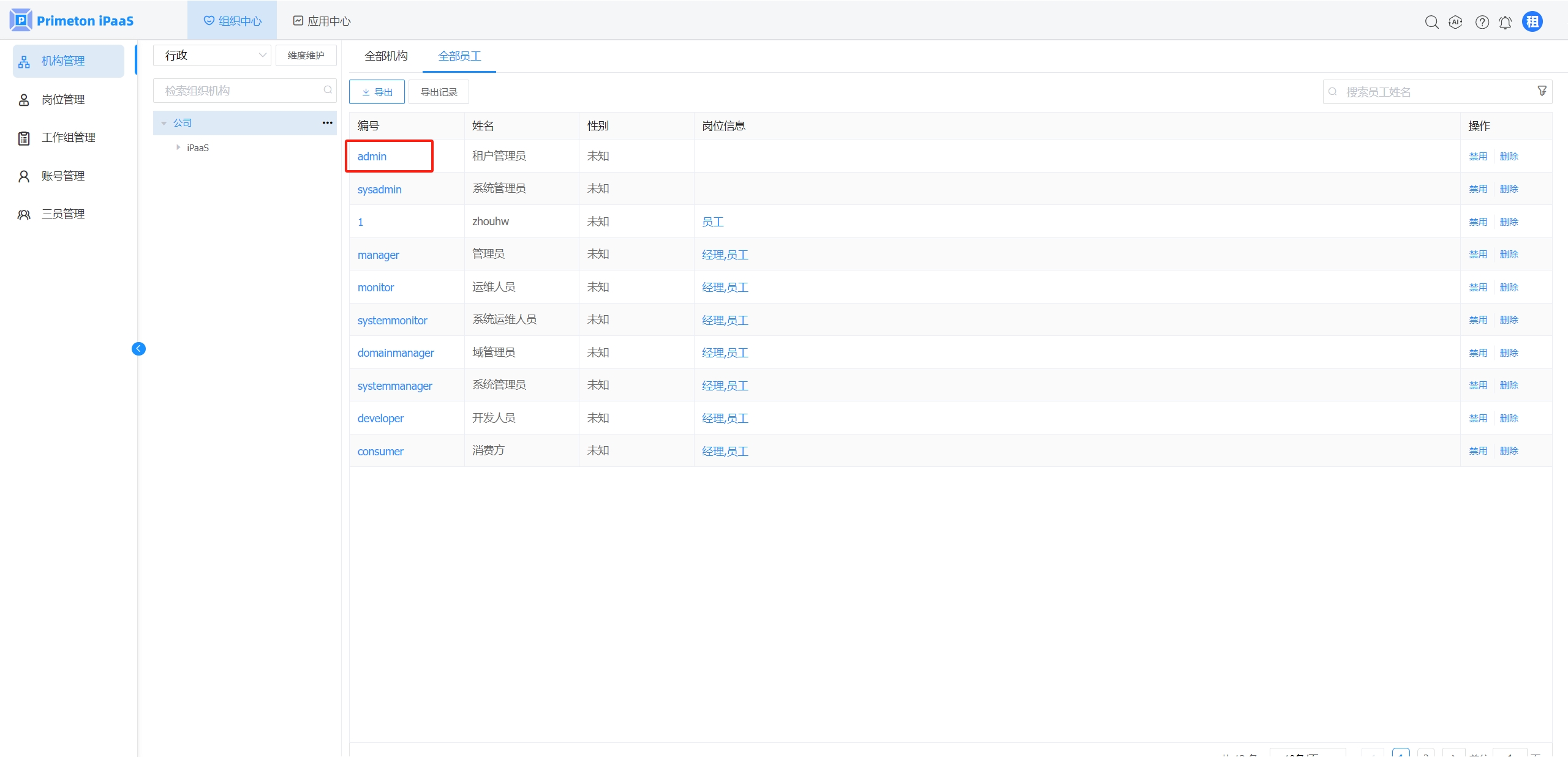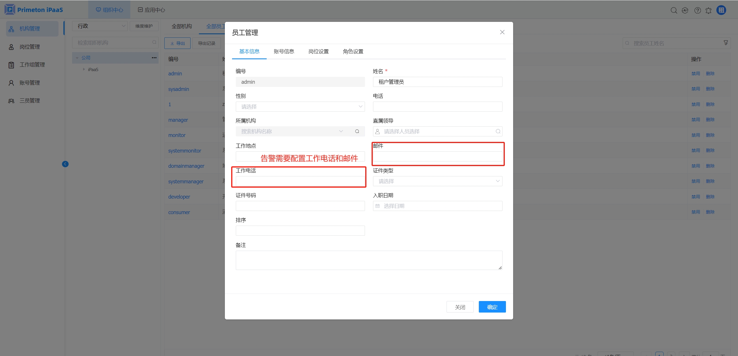 员工对应的邮箱或手机号设置,需切换admin(默认密码000000)用户登录系统,进入“组织中心”>"机构管理“>"全部员工“页面。