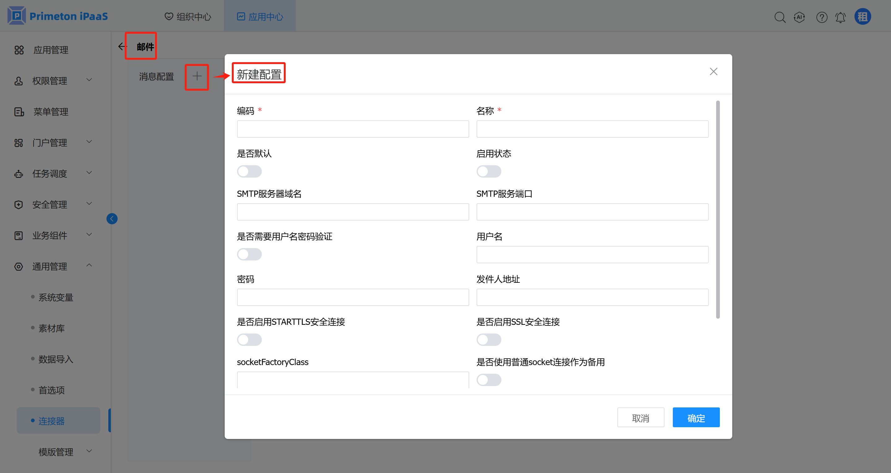 当没有可选的告警方式时,需切换admin(默认密码000000)用户登录系统,进入“应用中心”>"通用管理“>"连接器“页面,进行配置。