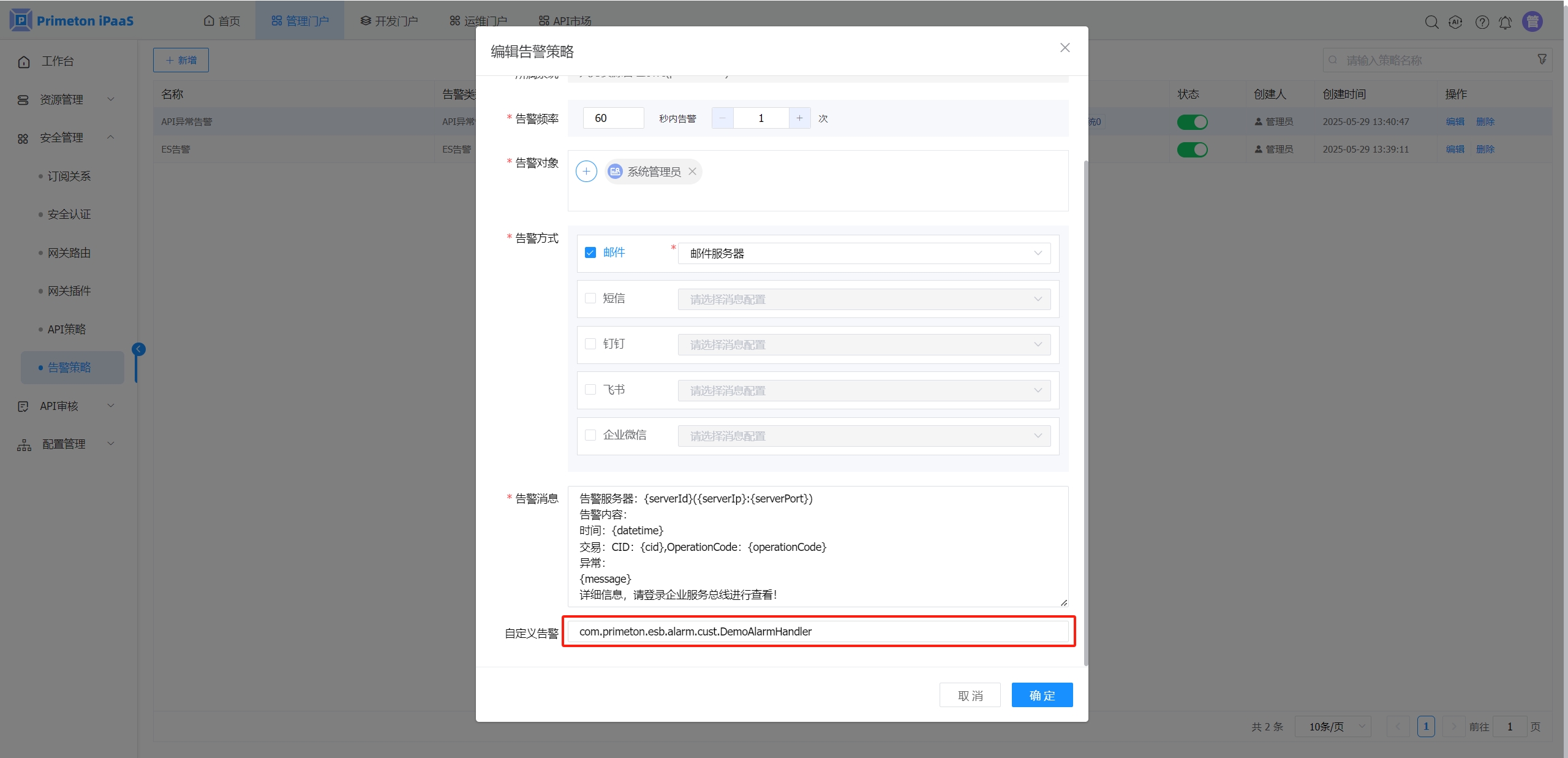 编辑告警策略,在自定义告警添加自定义告警类的全类名,然后保存。
