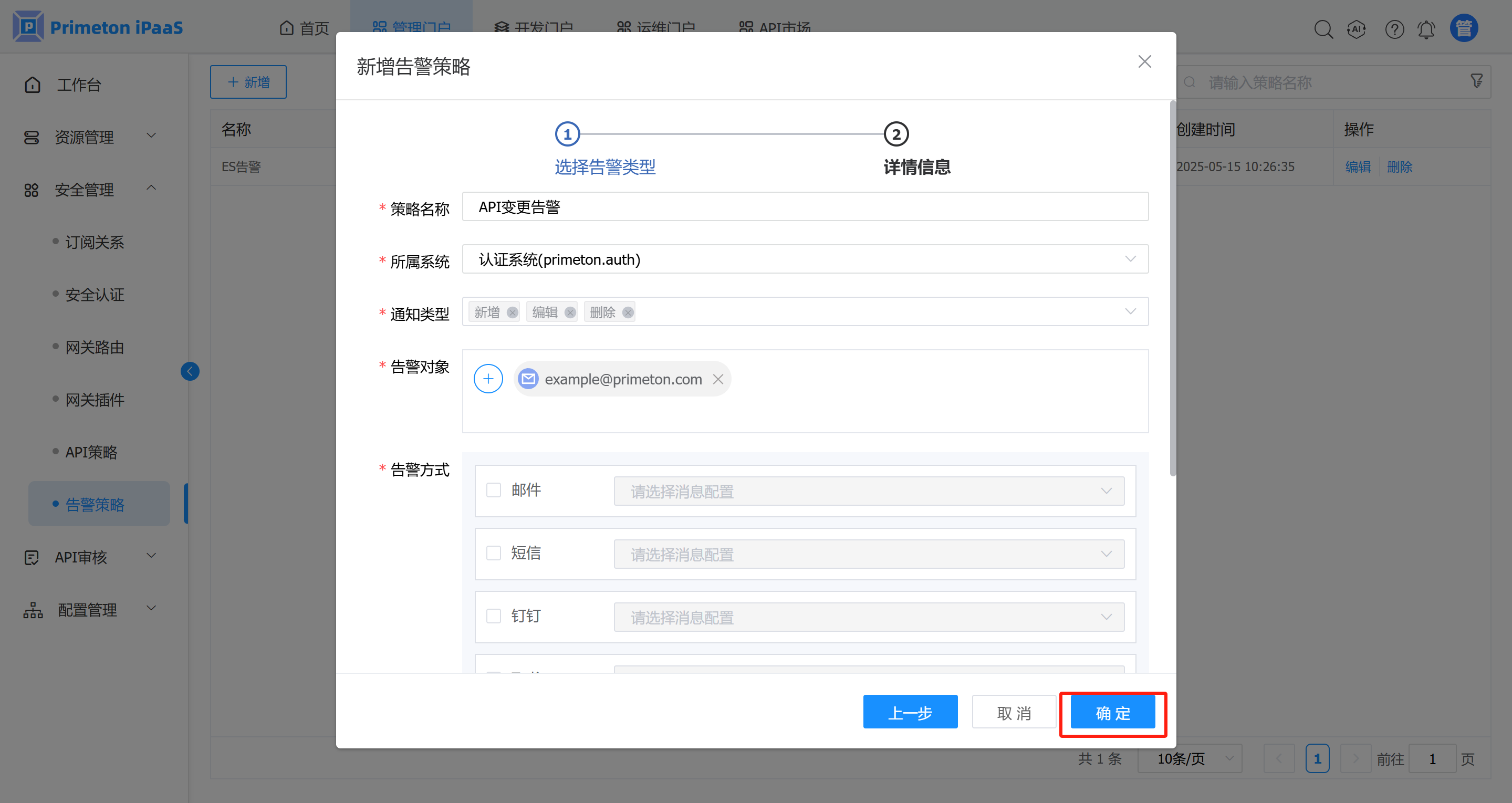 注意:API变更告警不会在系统告警列表显示,但是会发送告警信息。