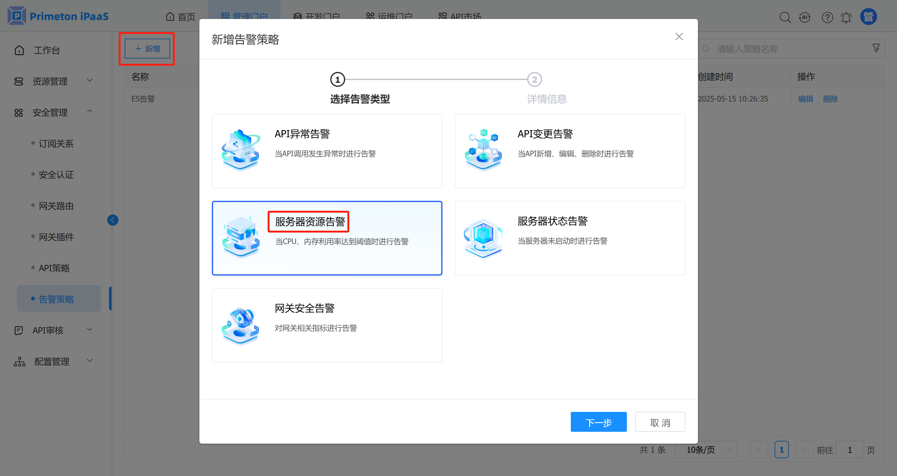 管理人员登录系统,进入管理门户,点击菜单“安全管理”>"告警策略“,进入告警策略页面。点击“新增”按钮,选择“具体的告警类型”,点击下一步,进入新增告警策略页面。即可选择告警对象。