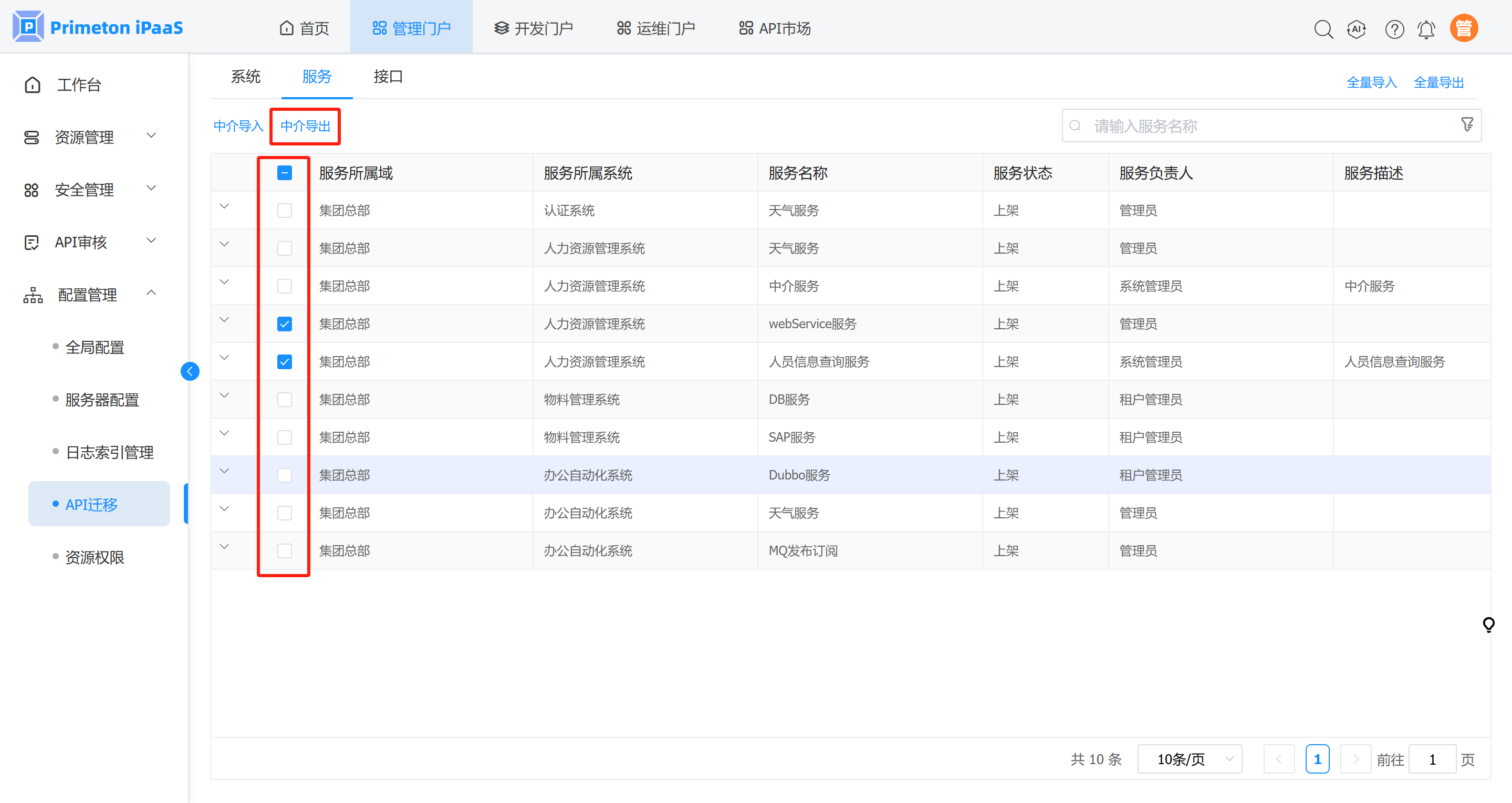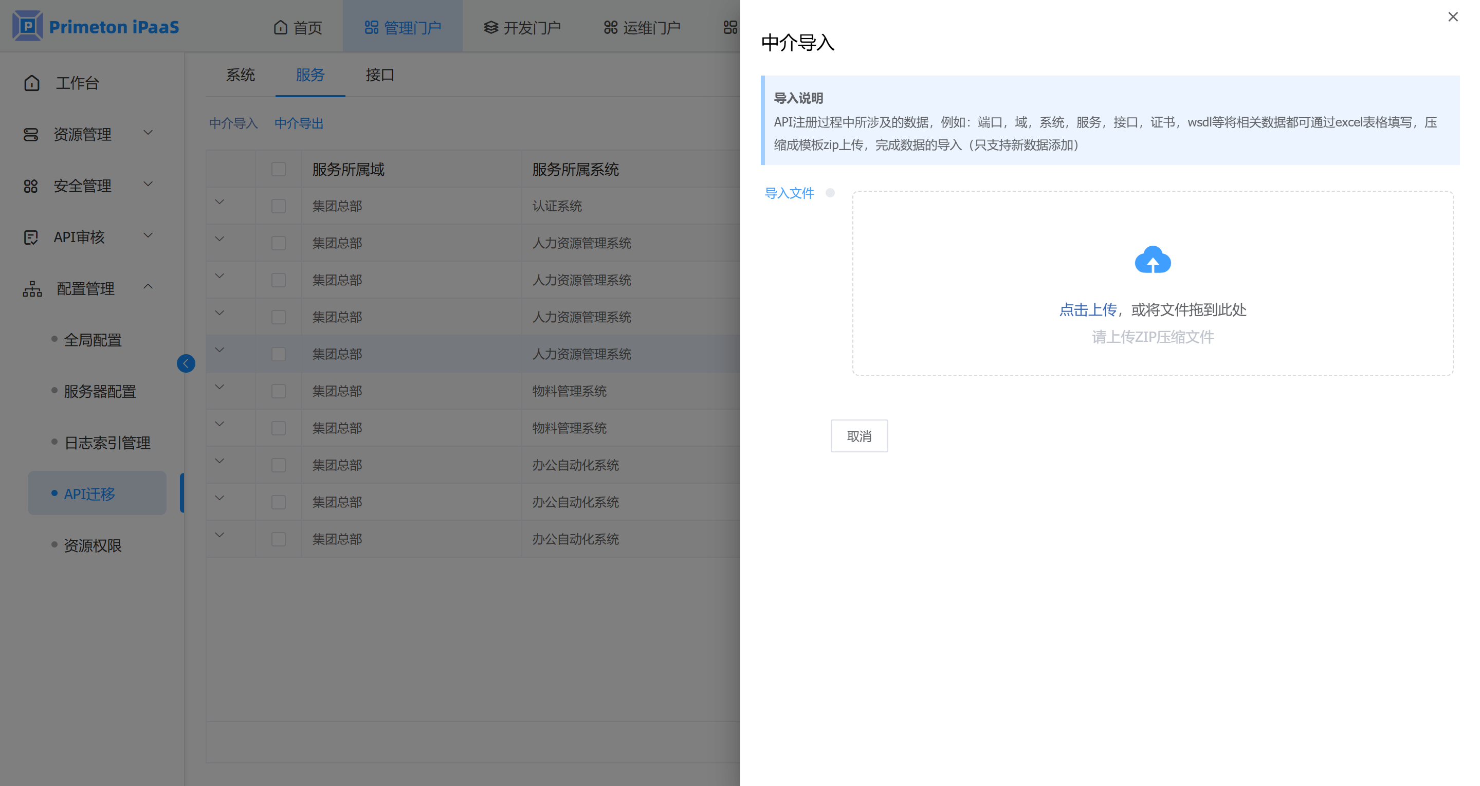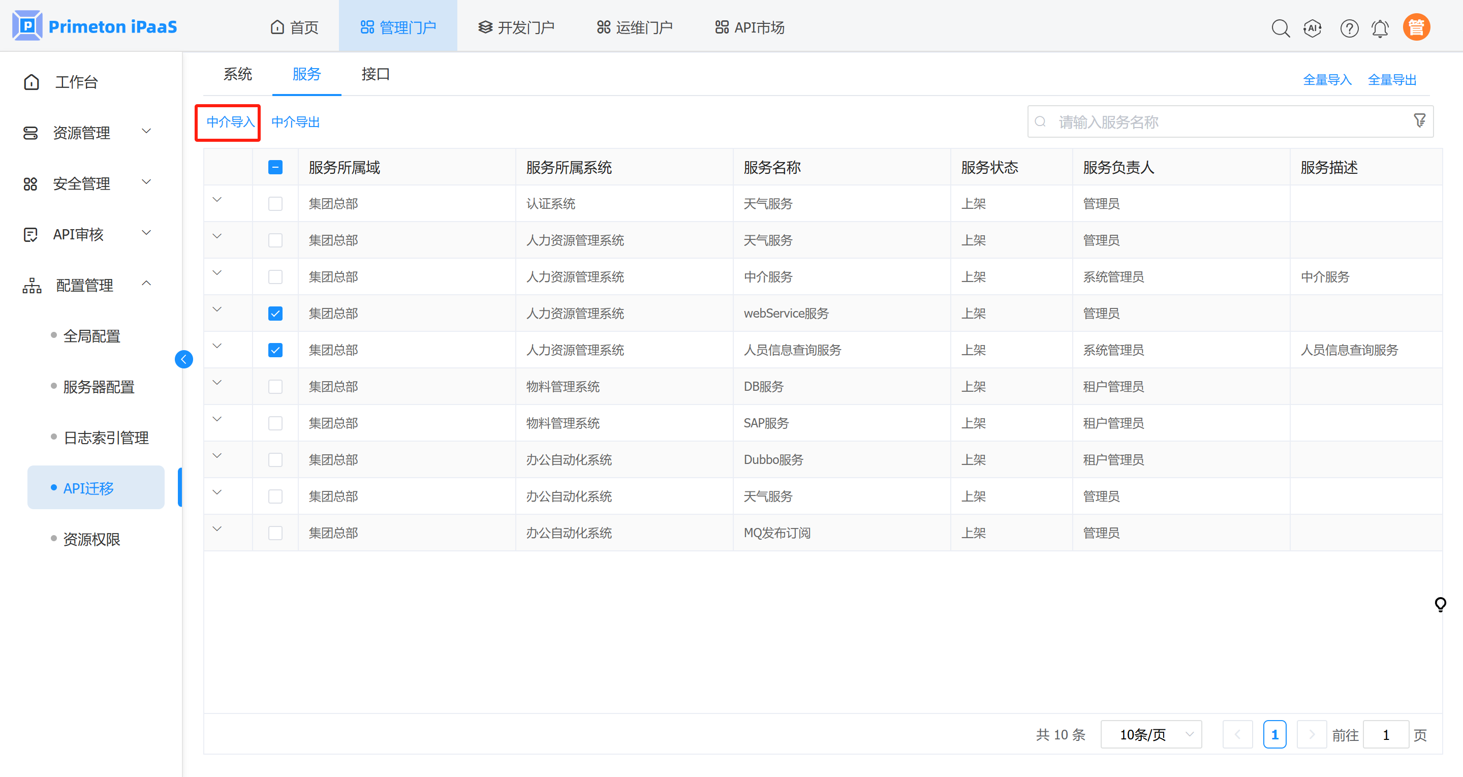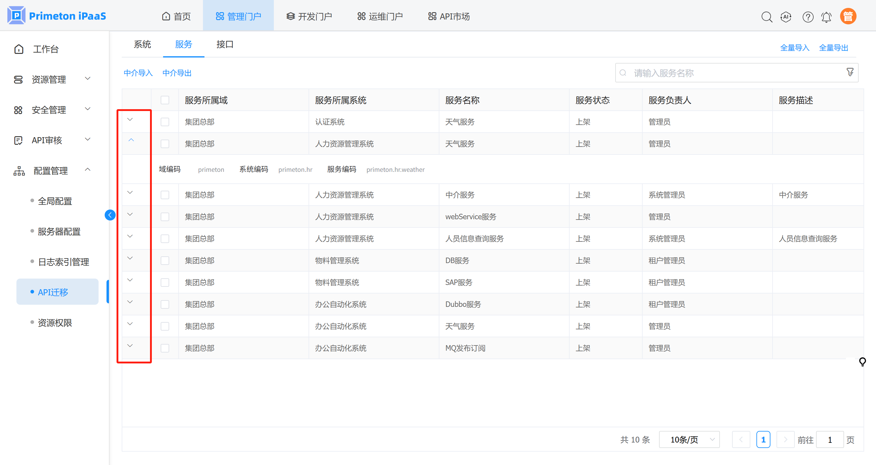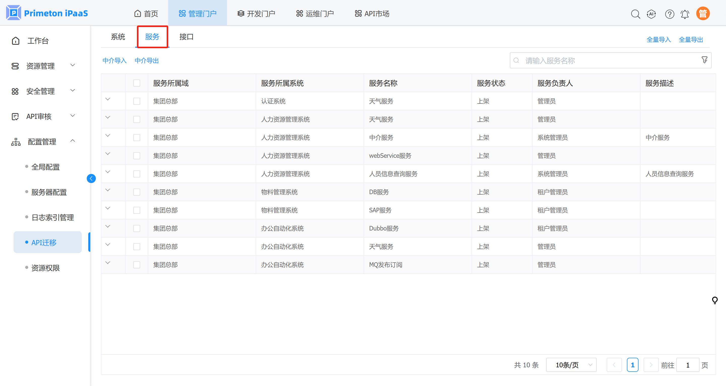 管理人员登录系统,进入管理门户,点击菜单“配置管理”>“ API迁移”,打开API迁移界面,进入”服务“页签。