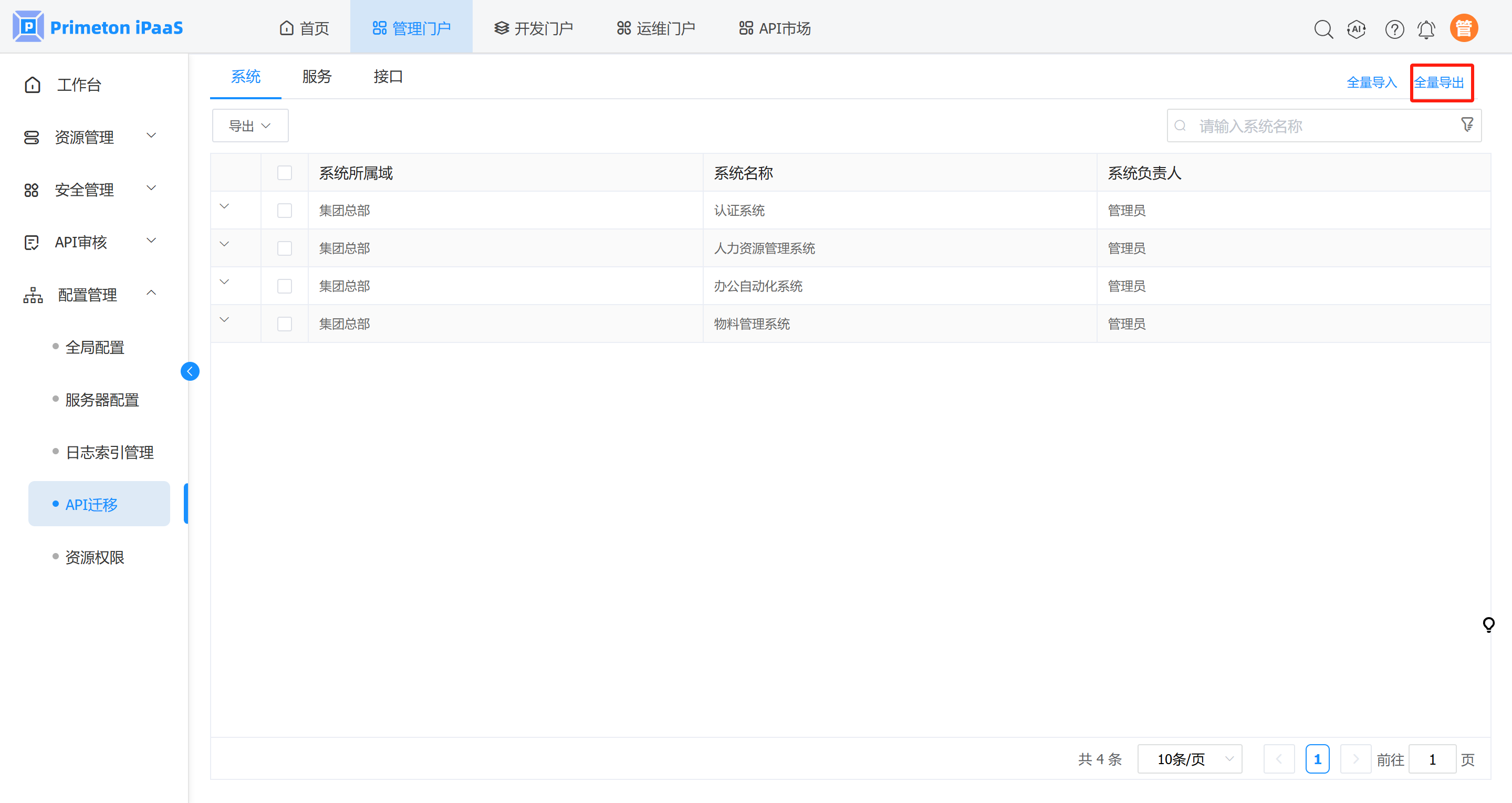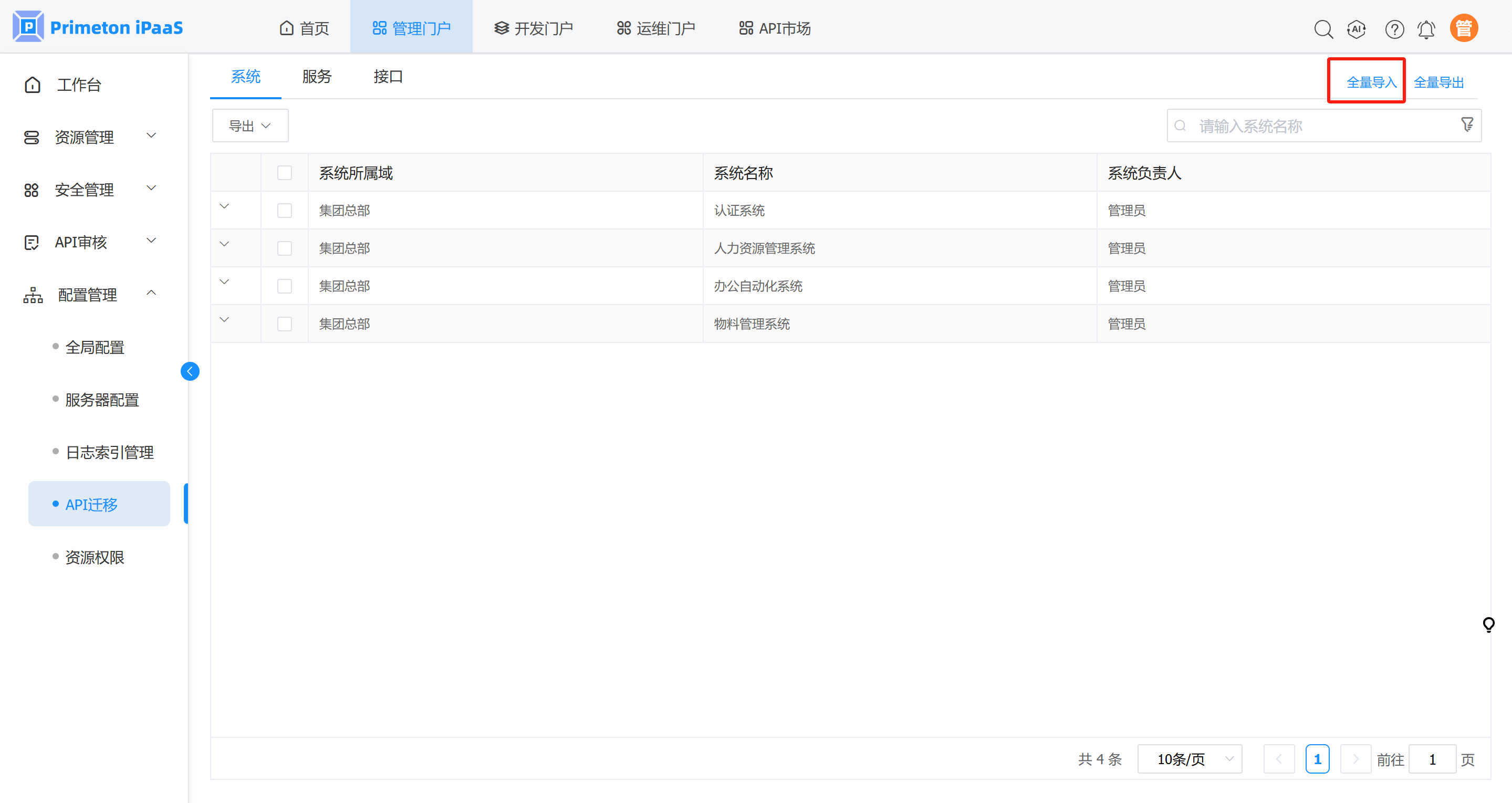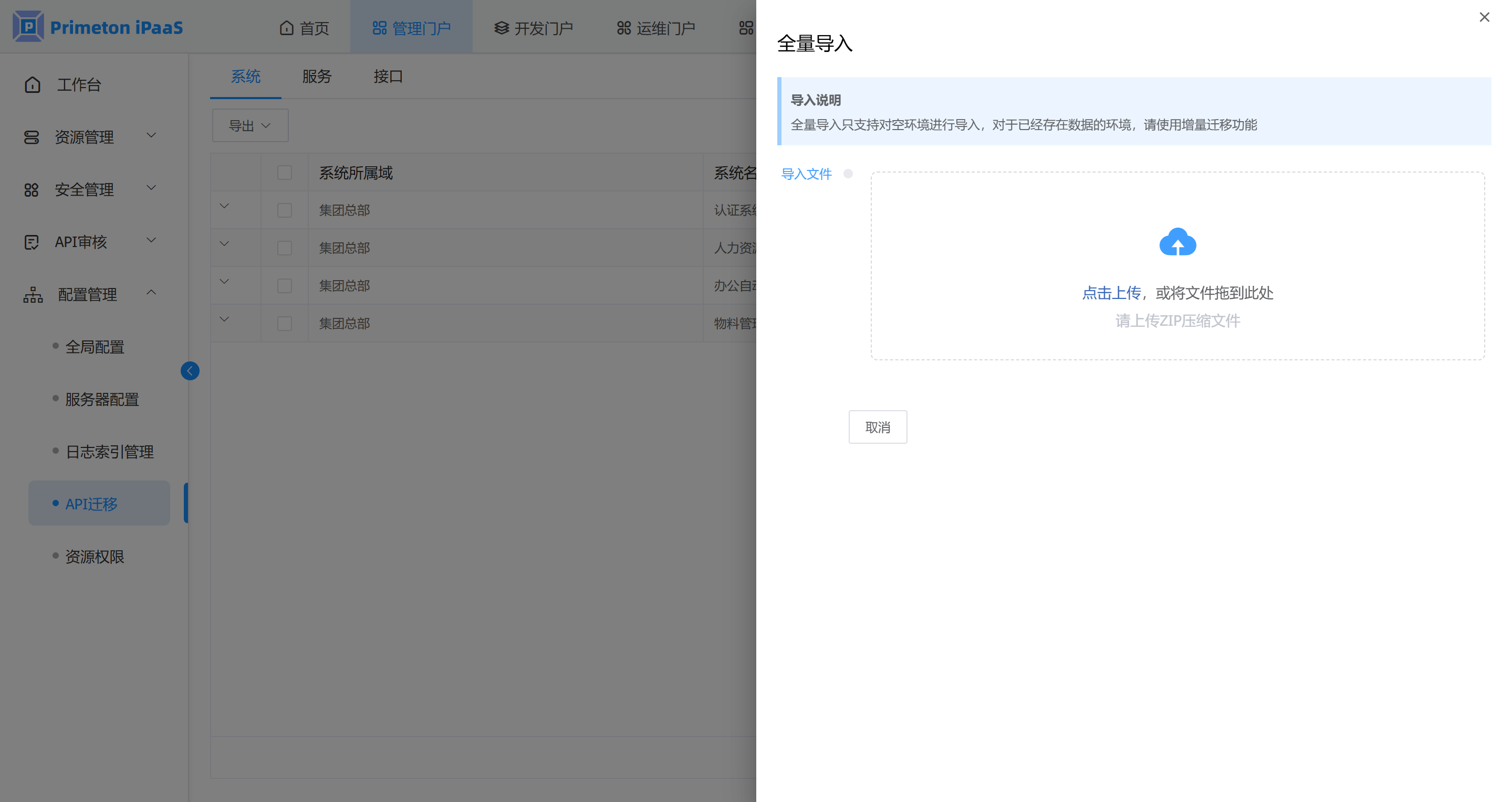 管理人员登录系统,进入管理门户,点击菜单“配置管理”>“ API迁移” ,右侧区域显示 “API迁移” 界面,右上角有“全量导入”、“全量导出”两个按钮主要功能分别是: