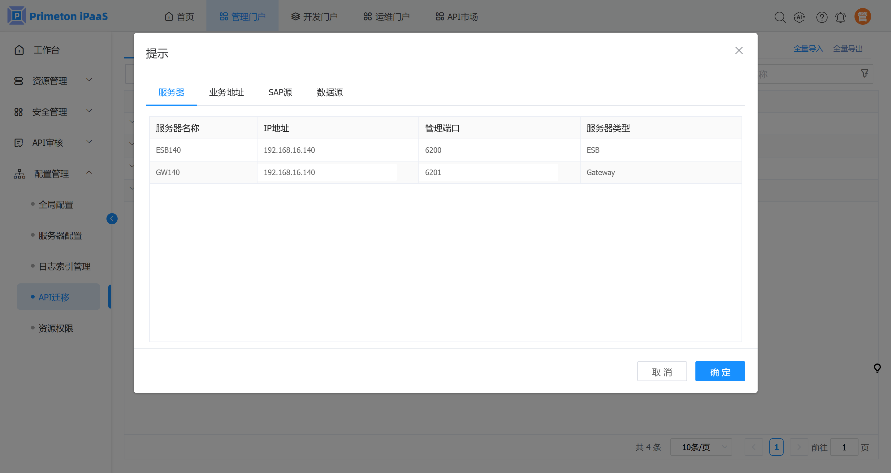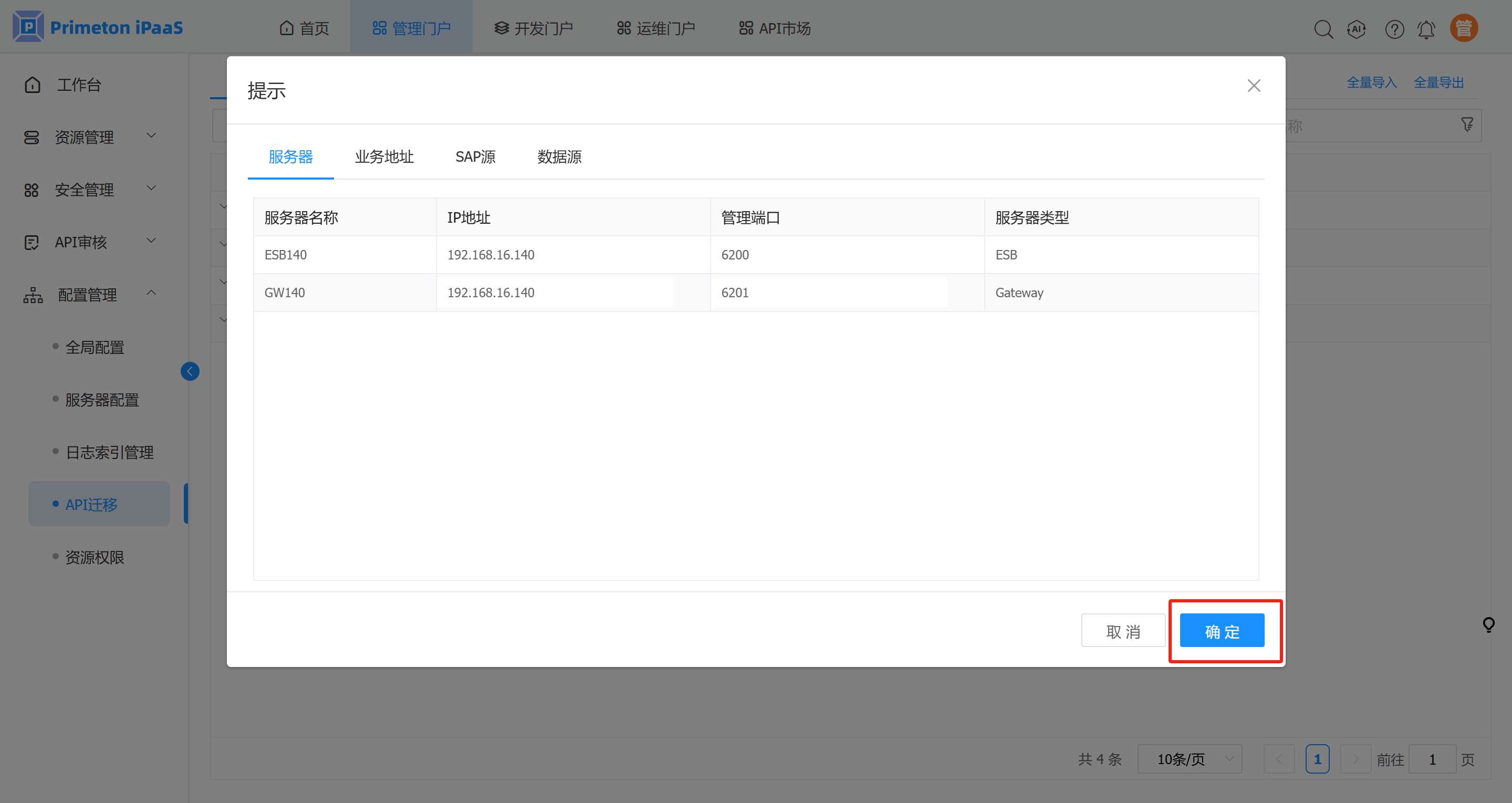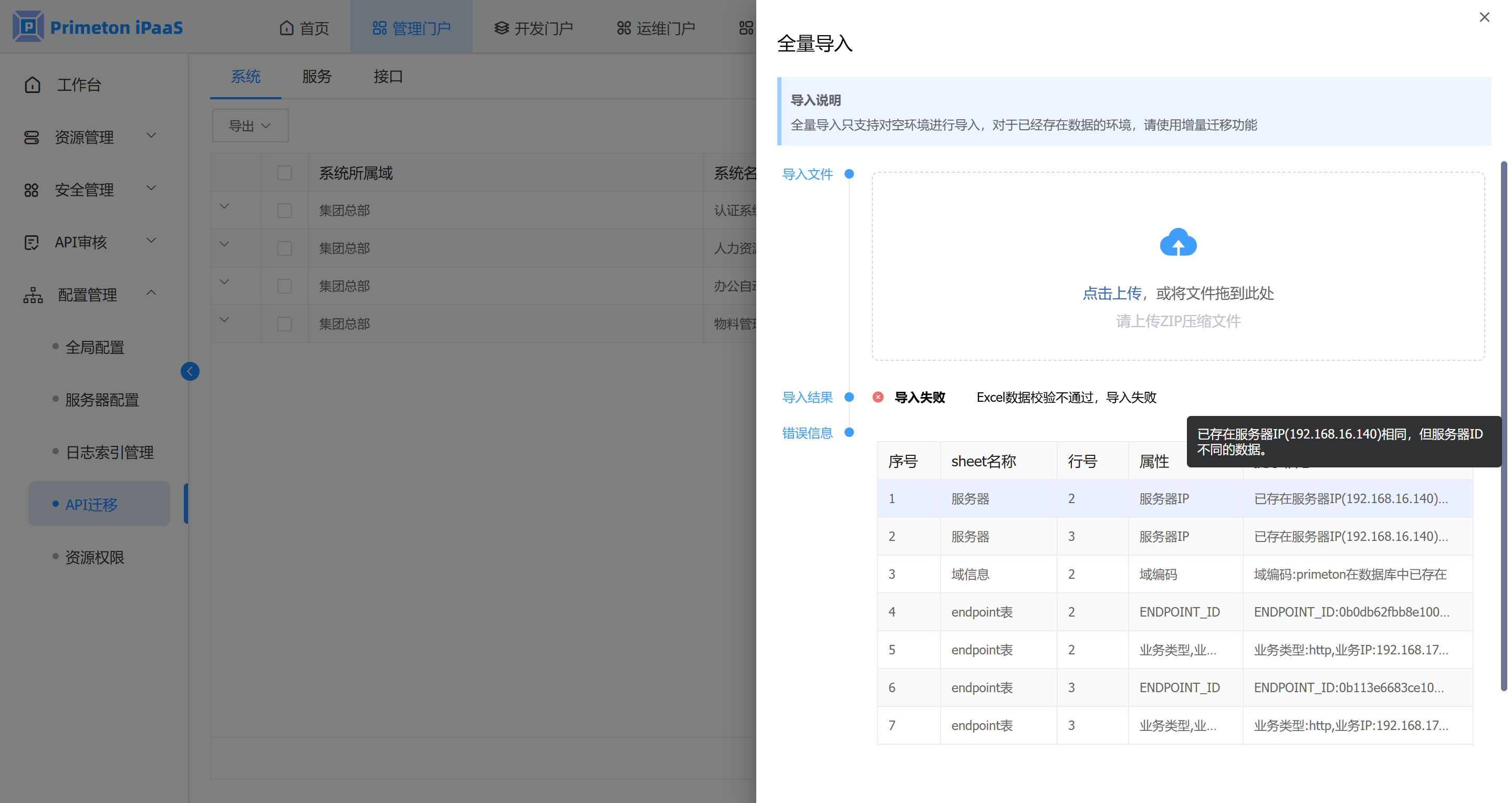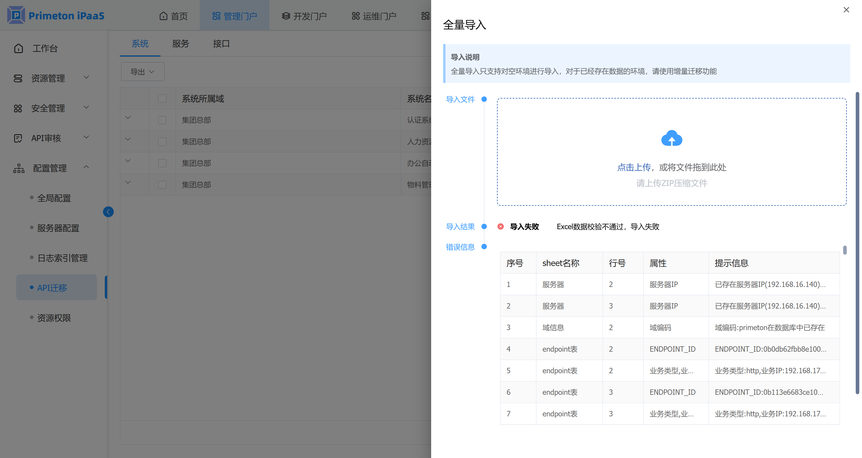 管理人员登录系统,进入管理门户,点击菜单“配置管理”>“ API迁移” ,点击“全量导入”按钮,进入全量导入确认页面。