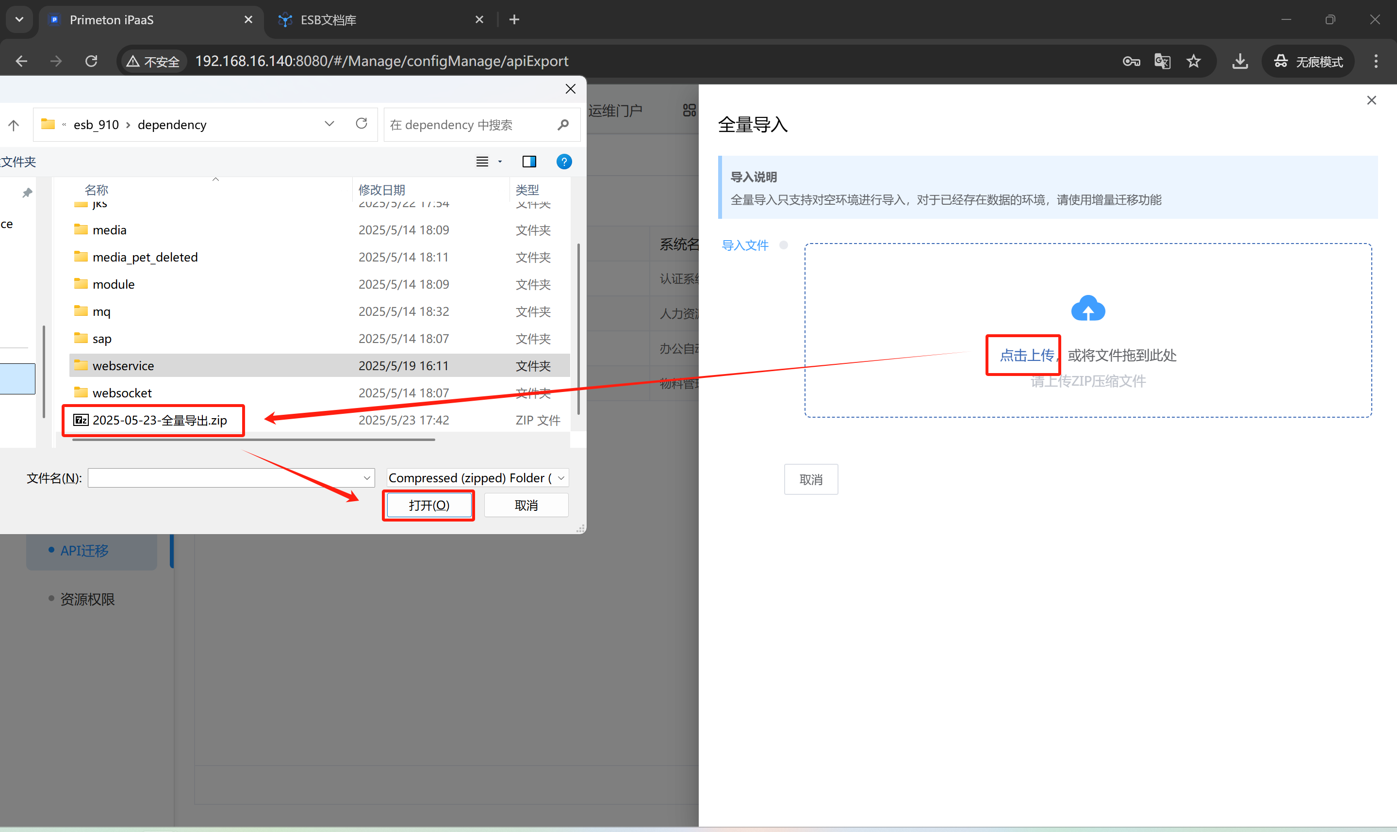 点击“点击上传”链接,打开本地文件目录,选中通过“全量导出”功能导出的zip文件,点击“打开”按钮,开始上传(上传耗费时长,请耐心等待)。