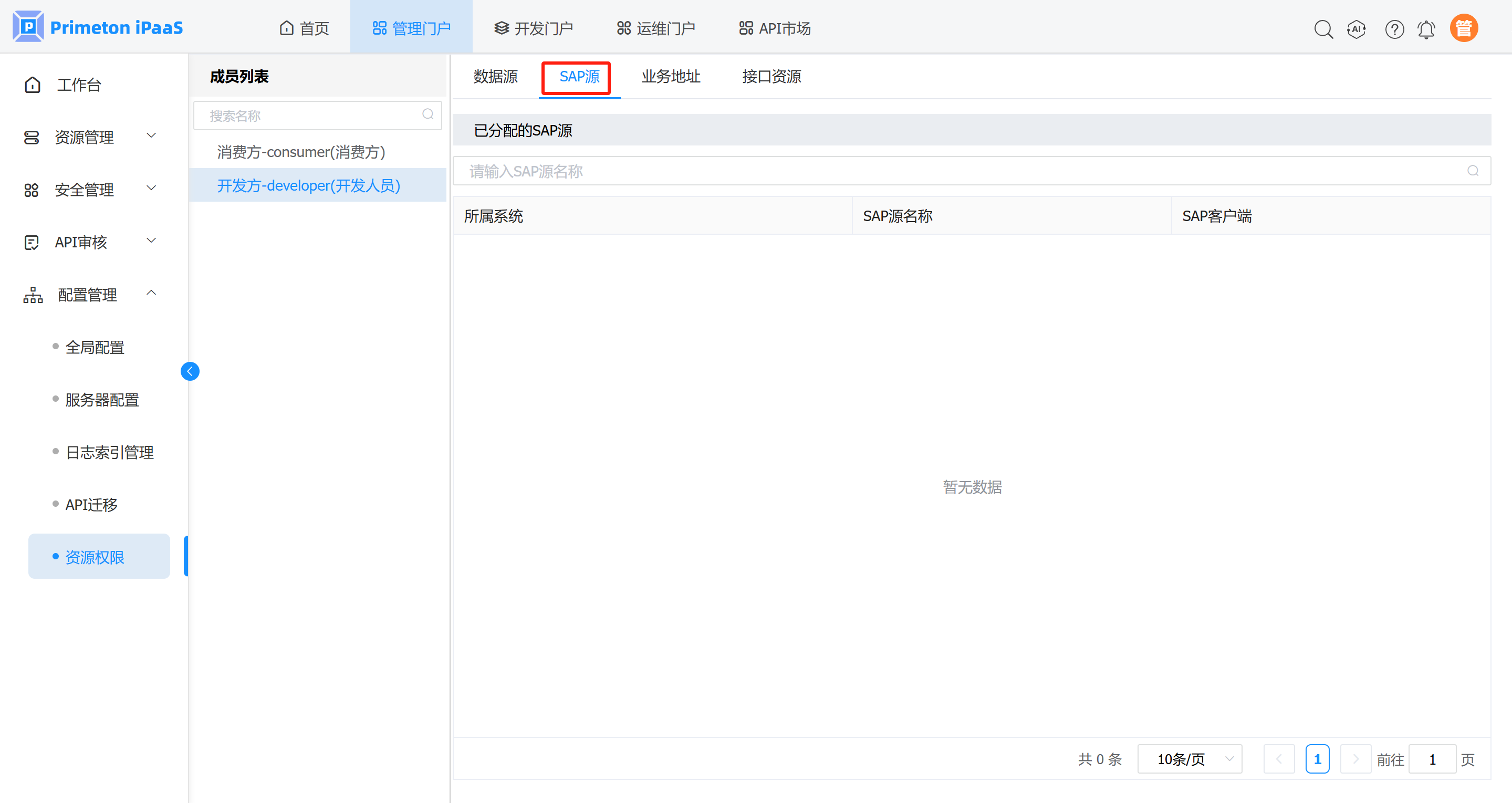 管理人员登录系统,进入管理门户,点击菜单“配置管理”>”资源授权“,进入资源授权界面,左侧展示成员列表,右侧展示数据源、SAP源、接口资源等资源授权页签。
