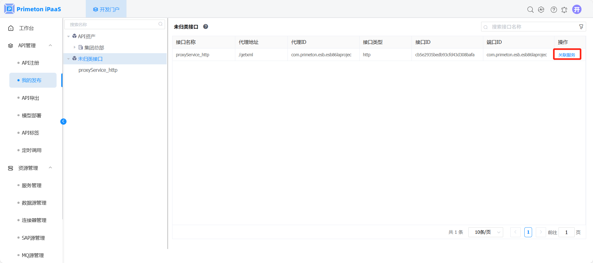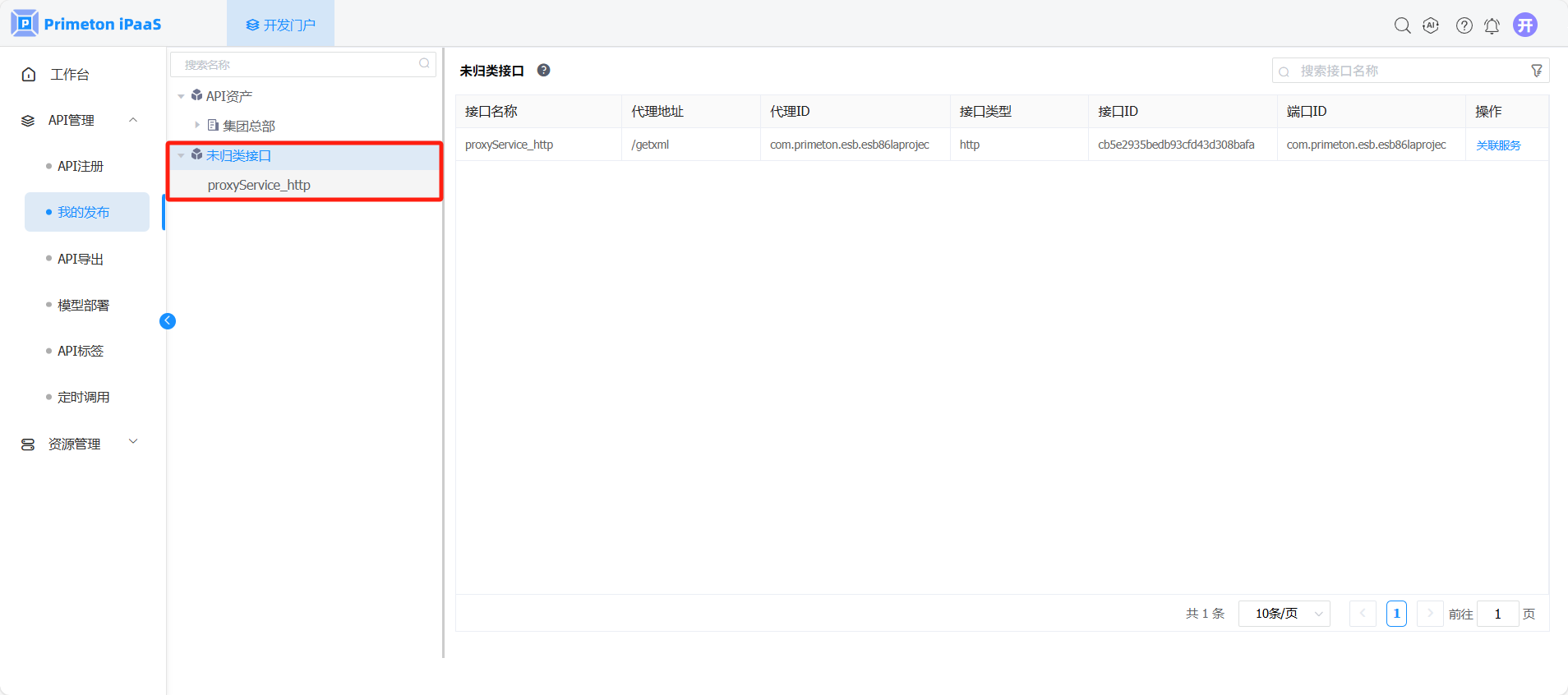 3. 在“开发门户 > API管理 > 我的发布“页面,在未归类接口类别中,选择记录点击操作列“关联服务”按钮,打开关联服务界面。