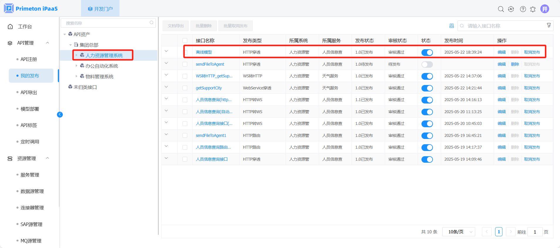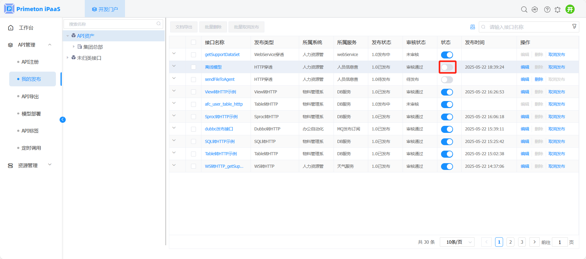2. 在“我的发布”界面,选择左侧组织树中API所属节点,选择需要上线的API发布记录,点击该记录状态列的开关按钮,上线接口。