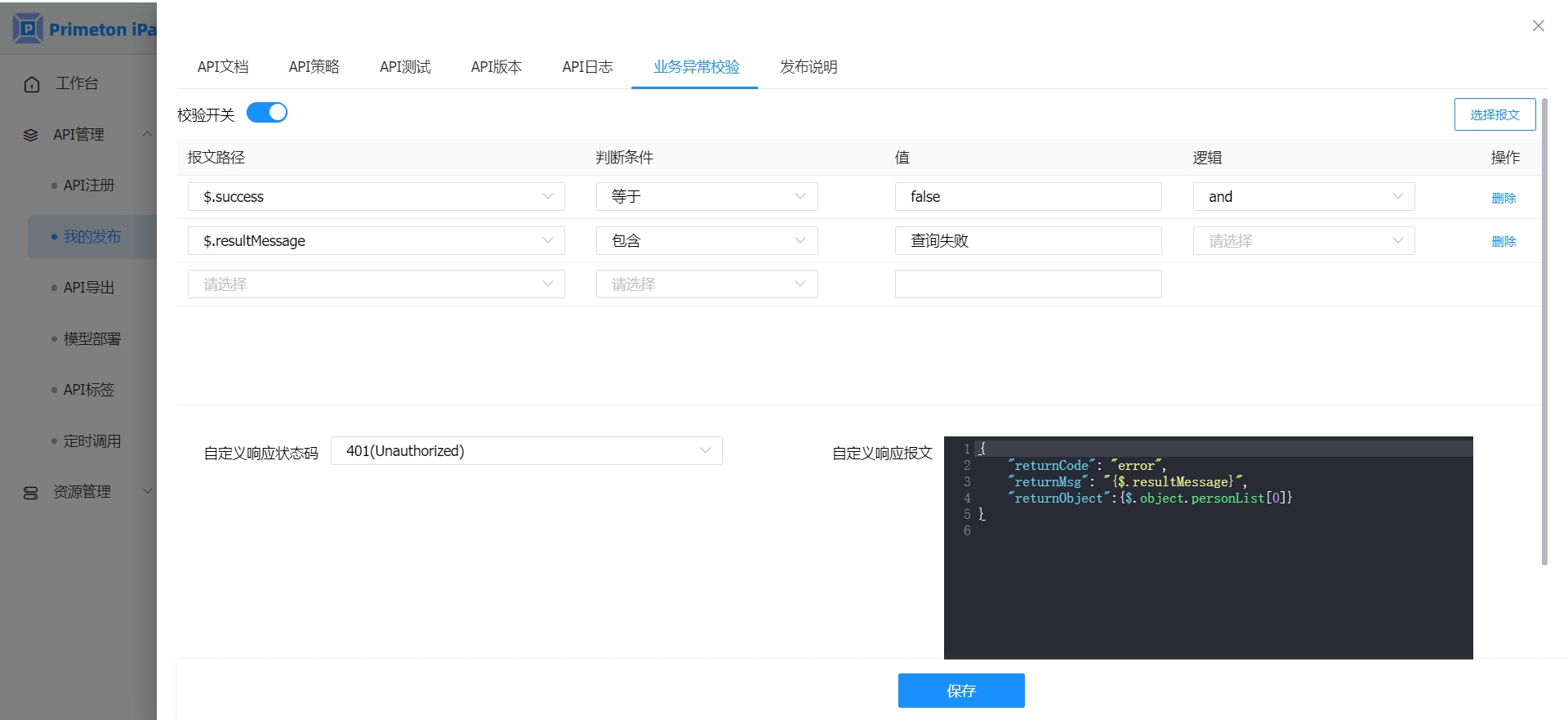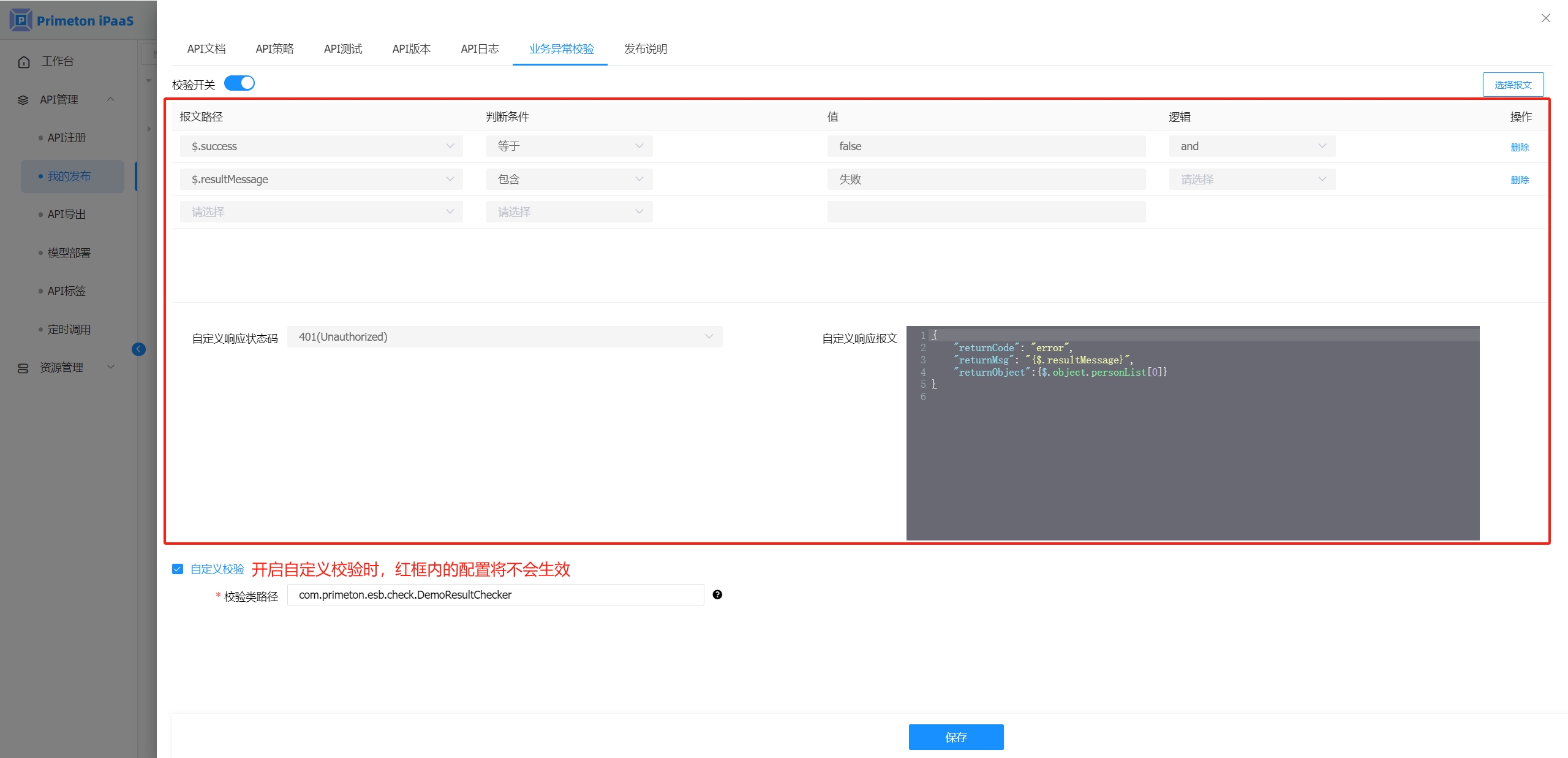 开启自定义业务异常校验后,业务异常校验只使用自定义业务异常校验,异常校验条件、自定义响应状态码和自定义响应报文将不会生效。