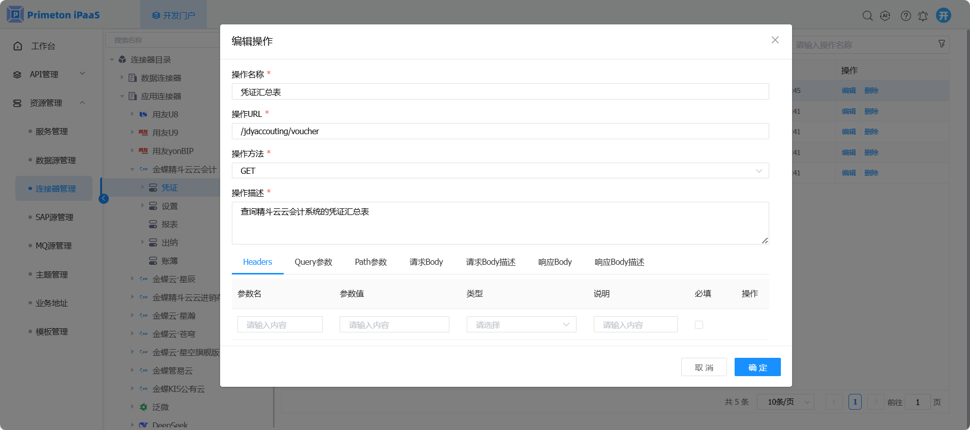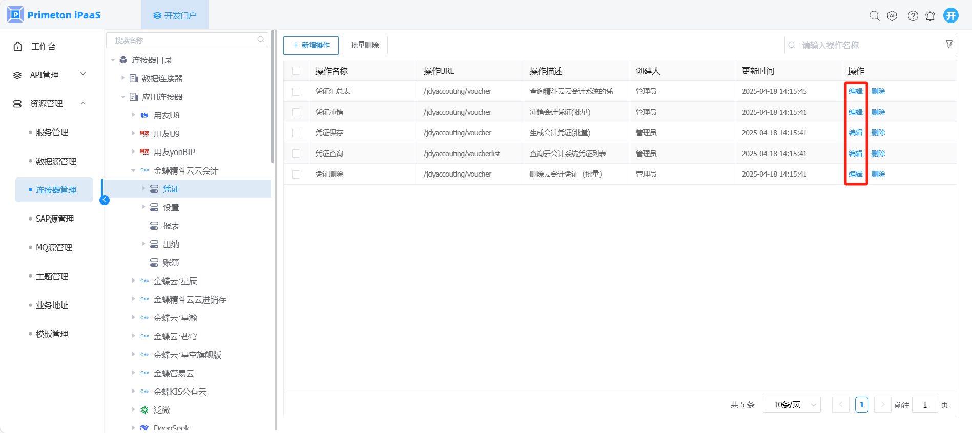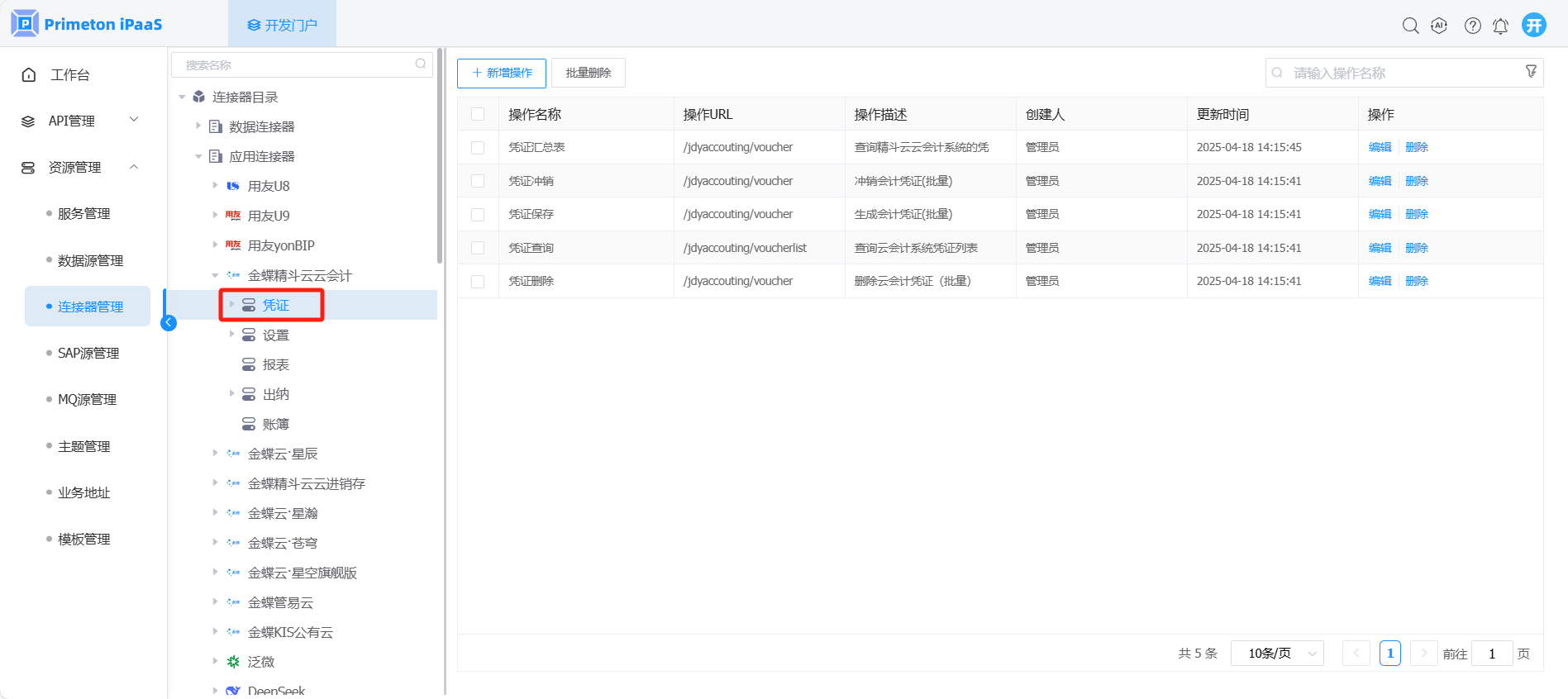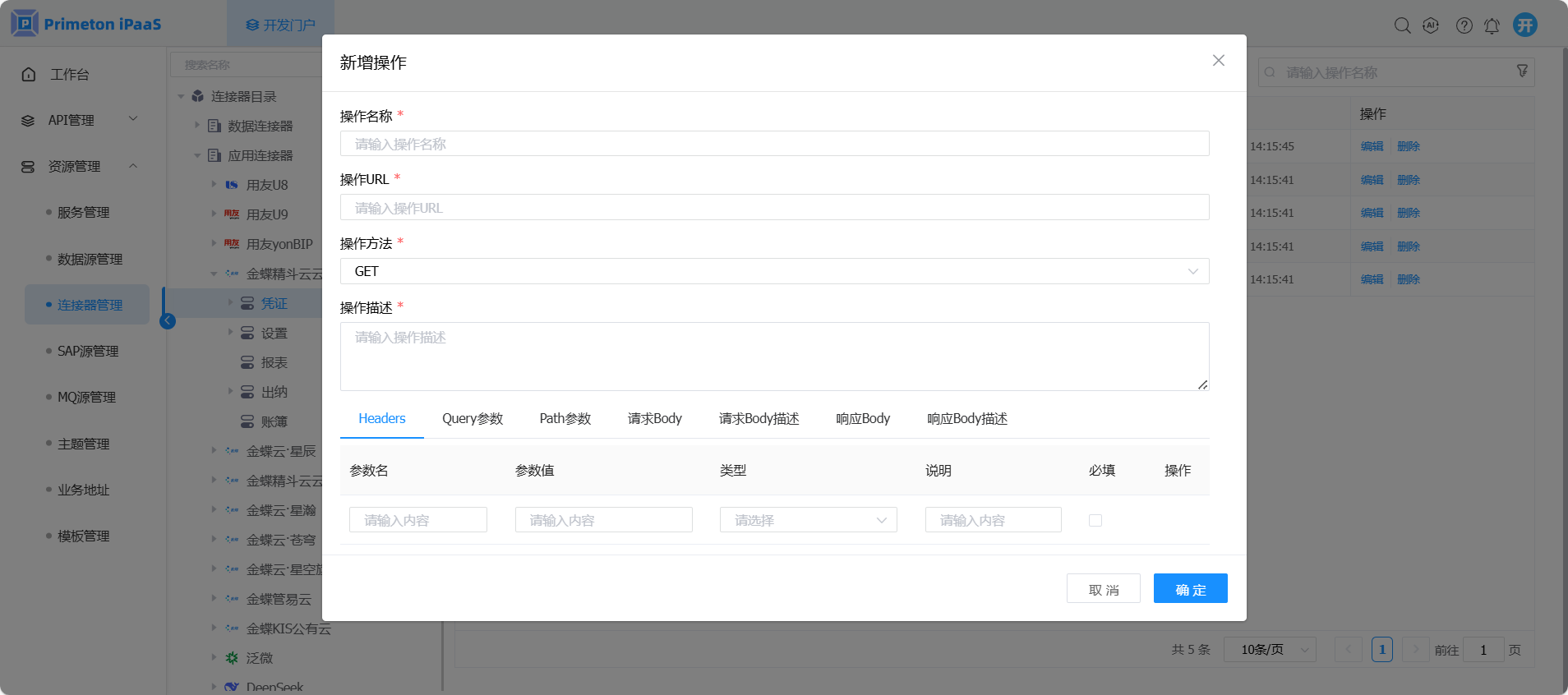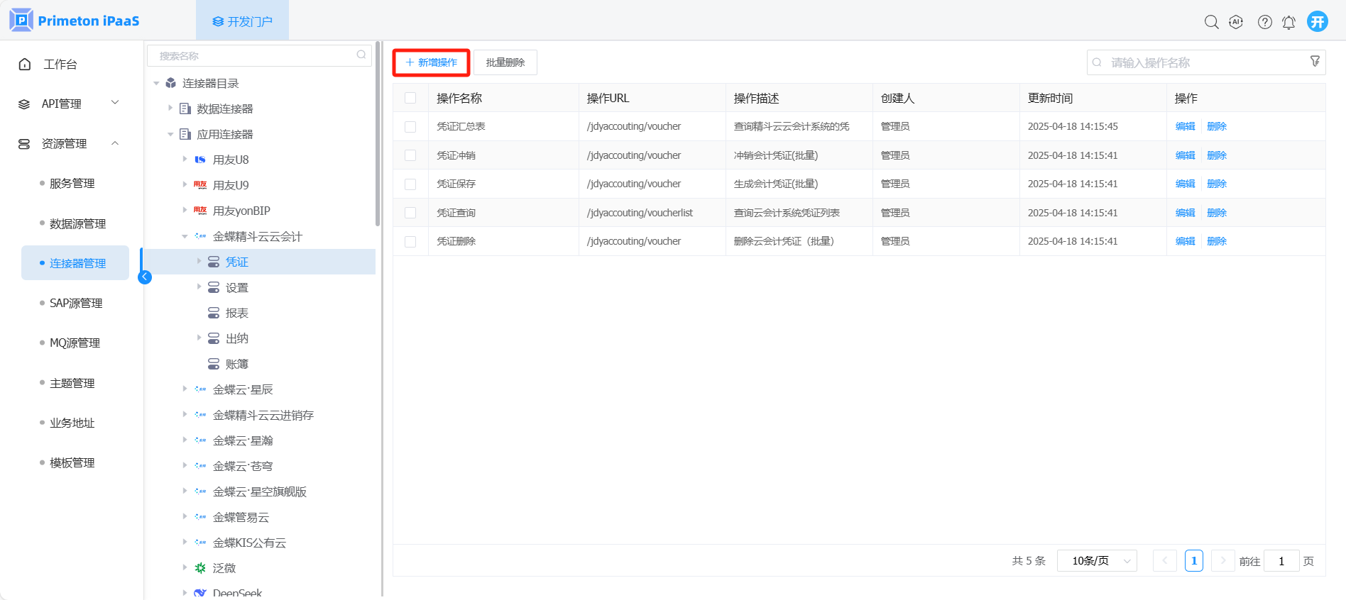 1. 开发人员登录系统,进入开发门户,点击菜单“资源管理“ >“连接器管理” ,右侧区域显示 “连接器管理”界面。
