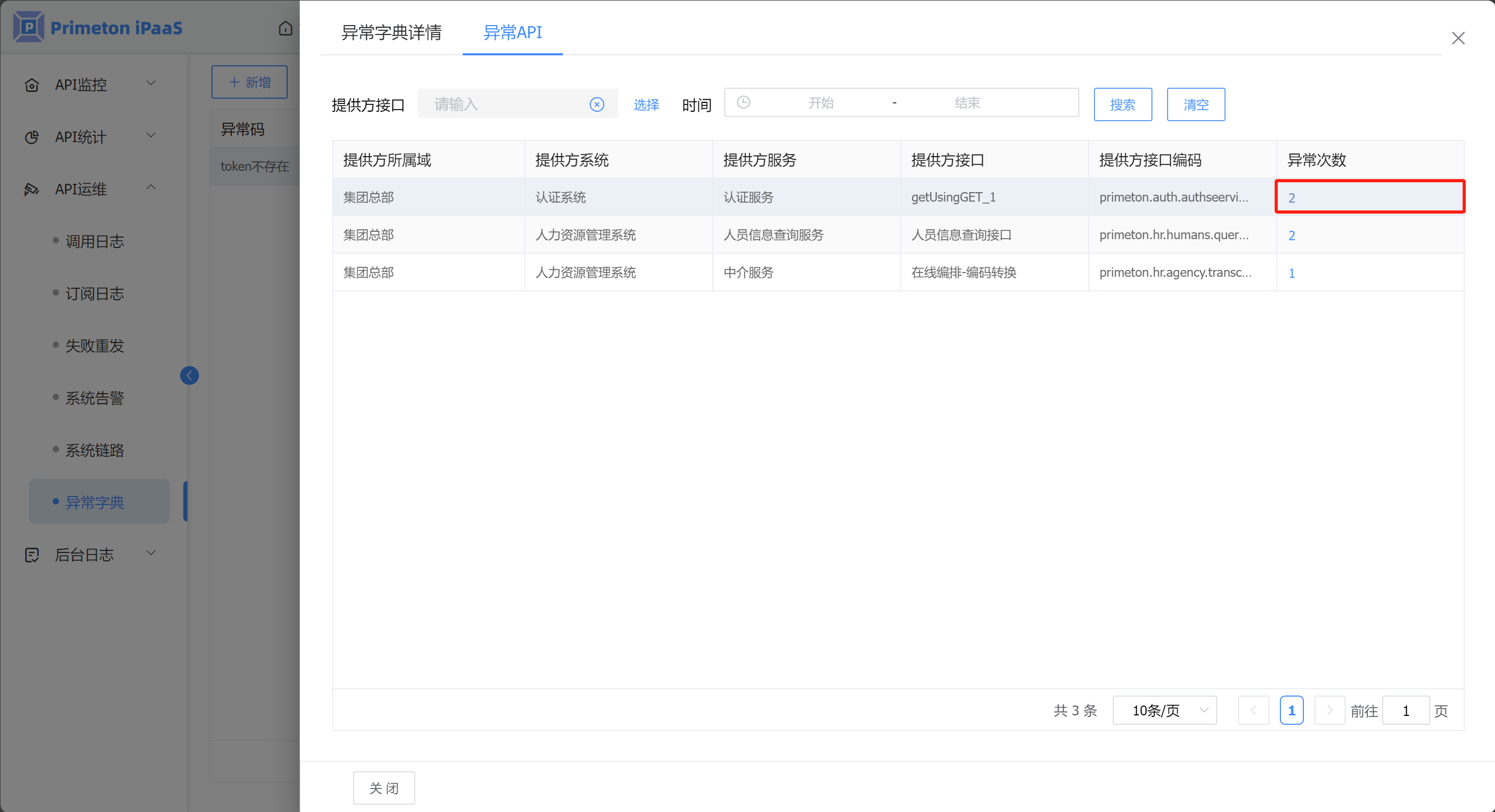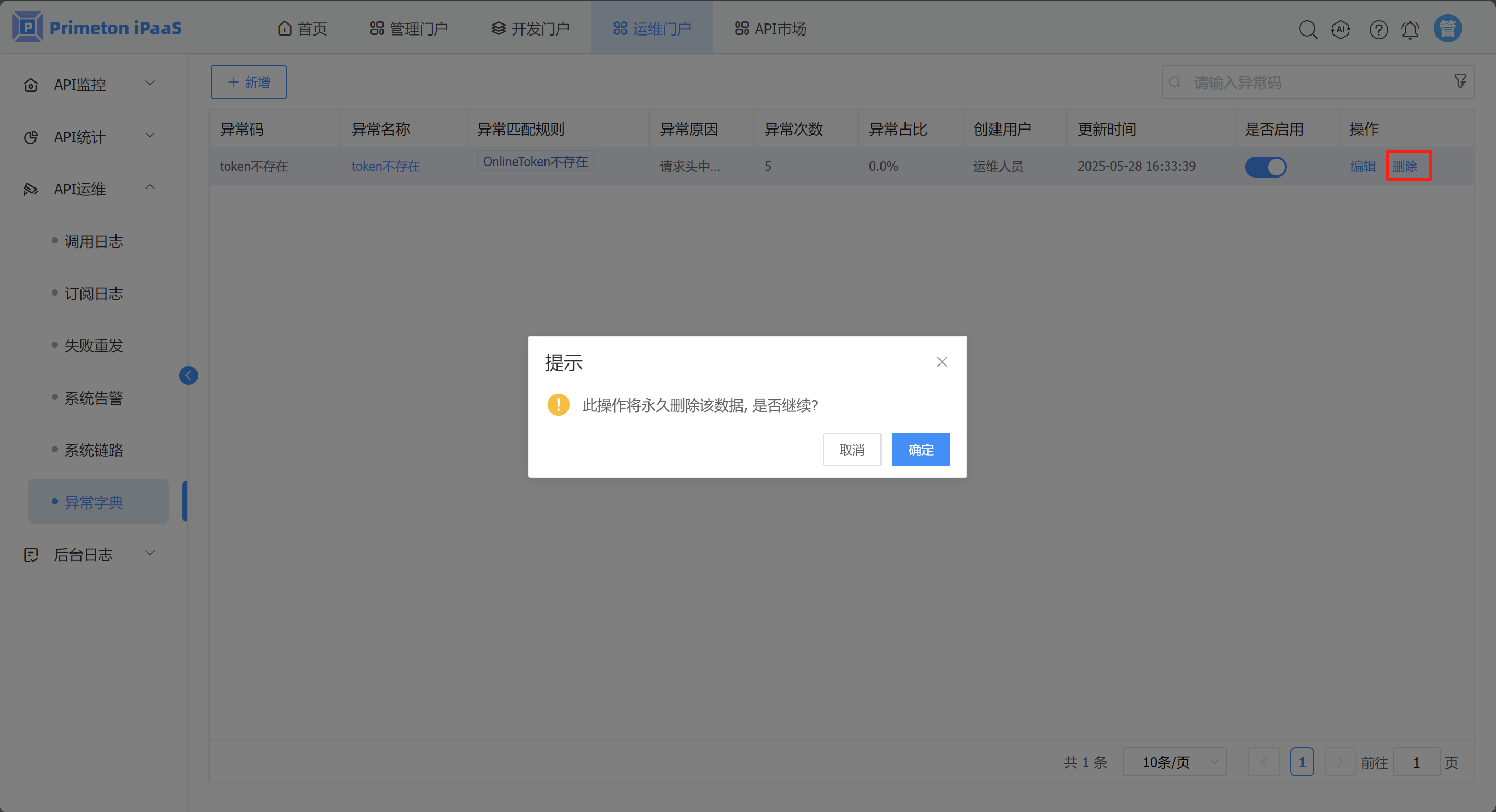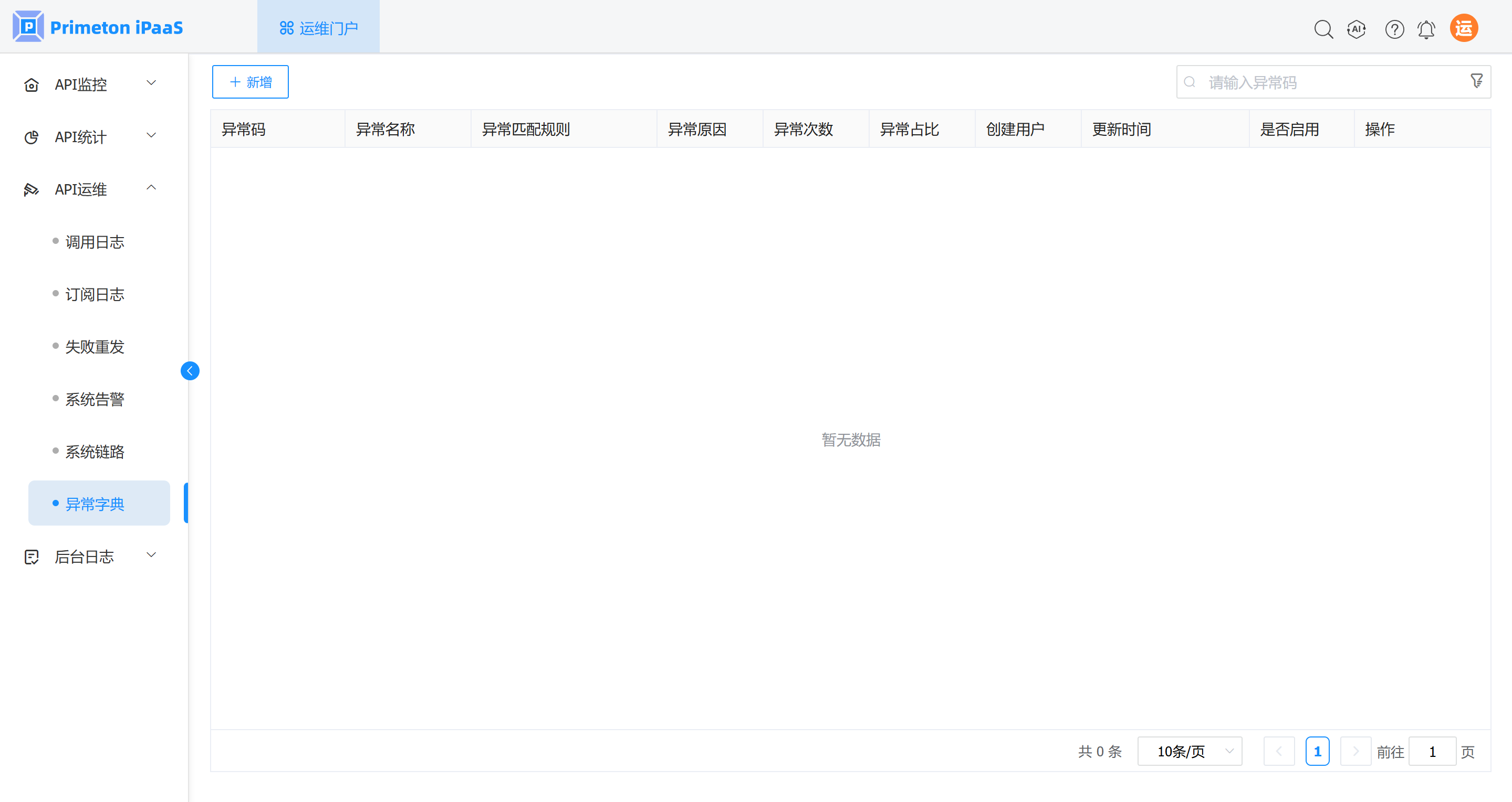 1. 登录运维人员账户(monitor/000000),进入运维门户,点击菜单“API运维”>“异常字典”,进入“异常字典”页面。