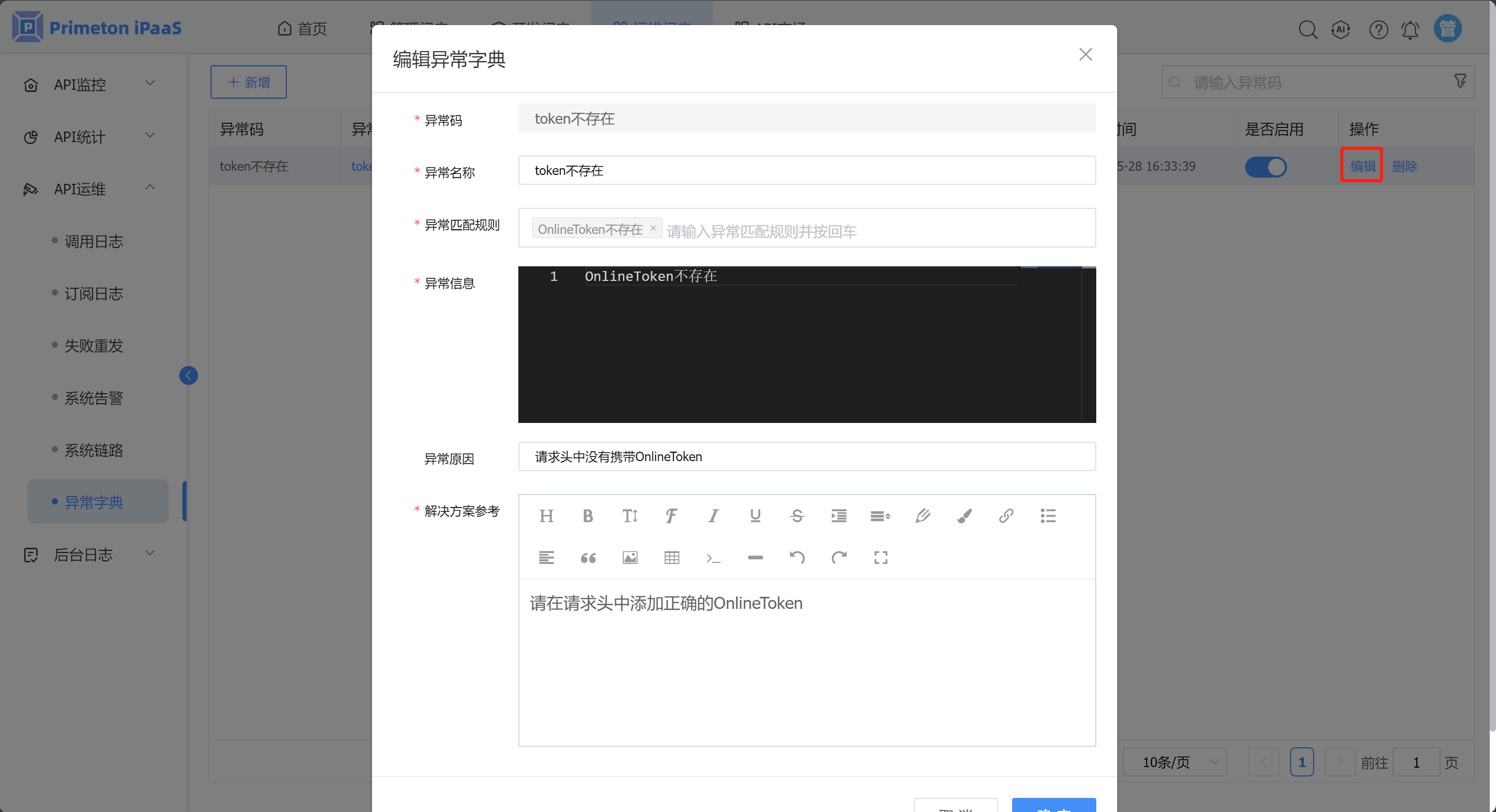 点击编辑,可对异常字典进行编辑。