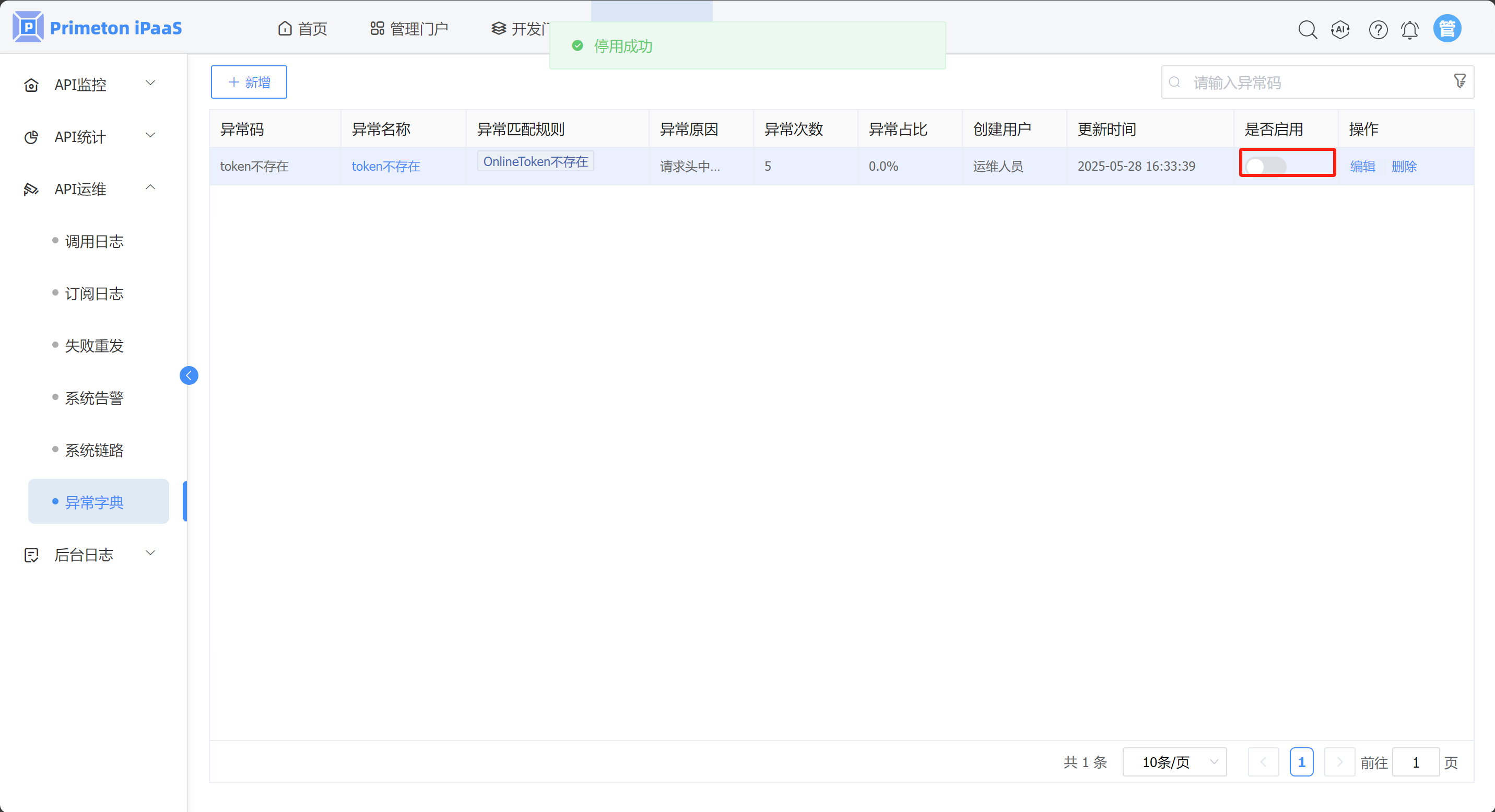 异常字典停用后,后续调用接口不会统计该异常。