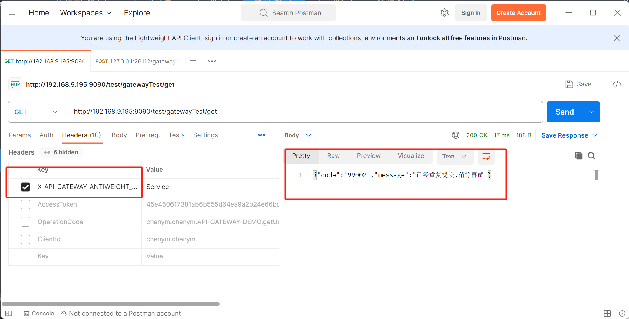 请求头中携带“X-API-GATEWAY-ANTIWEIGHT_APP”,3秒内重复请求时会返回如下信息: