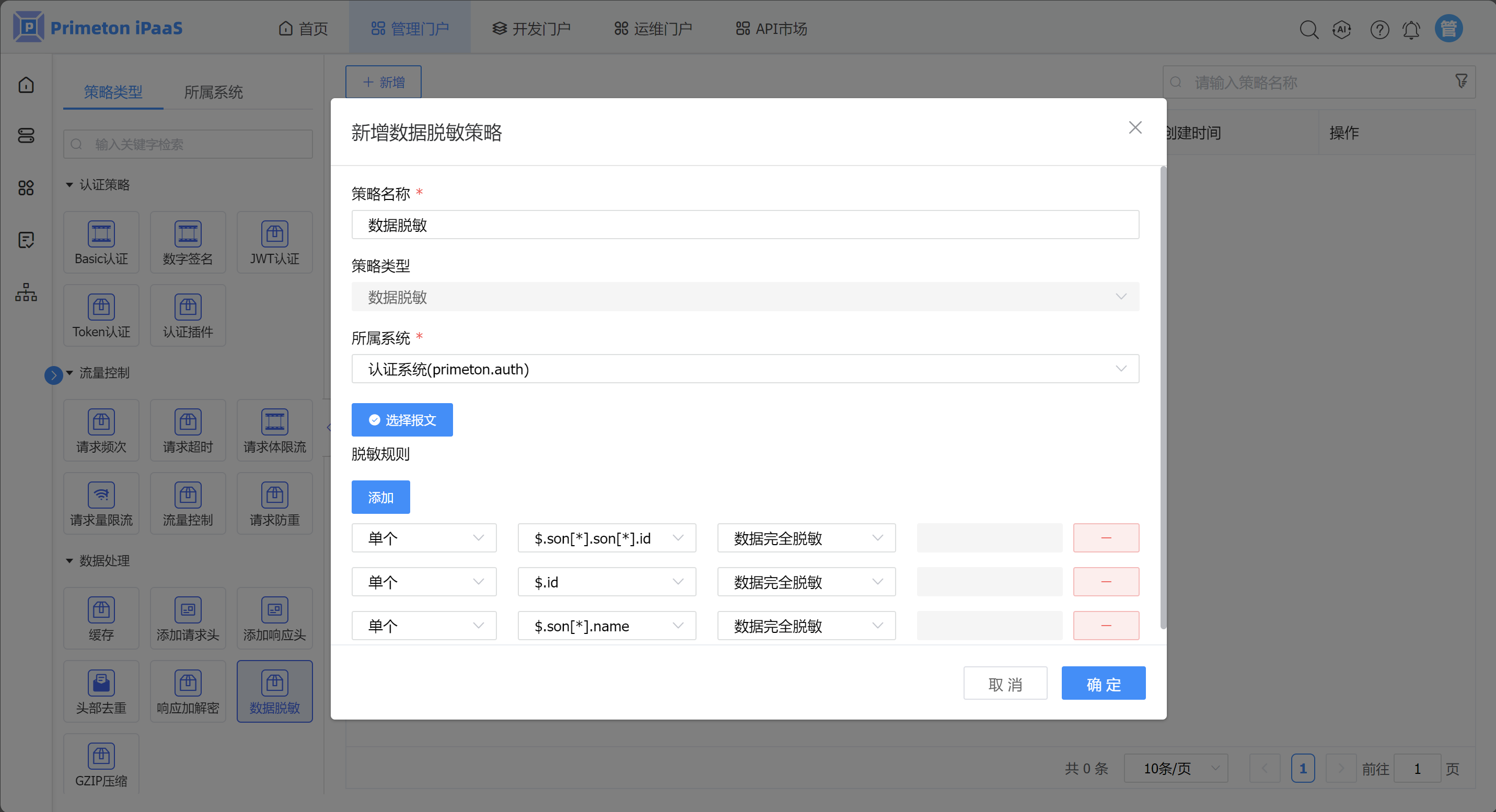 数据脱敏策略是对响应内容进行脱敏,防止敏感信息泄漏。 此策略仅对json和xml格式的响应内容有效。
