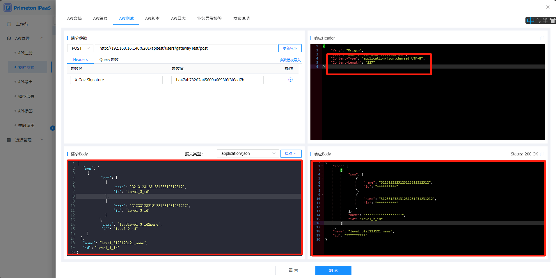 2. 添加策略到API接口,在"API测试"中,查看数据脱敏策略调用结果: