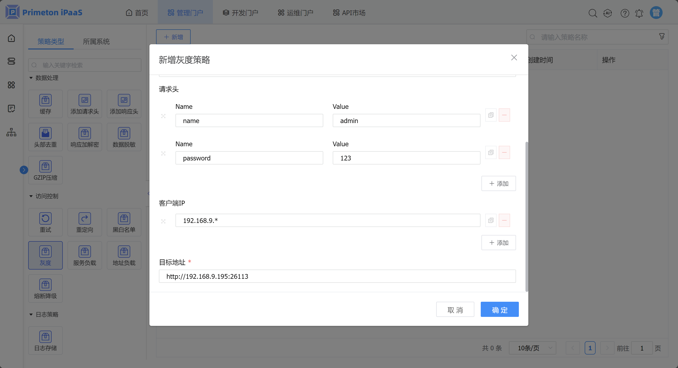 1. 新增灰度策略,配置路由转发的匹配条件: