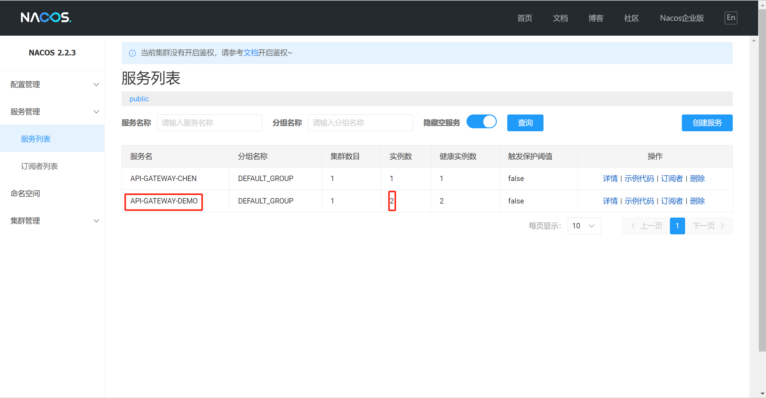 配置nacos服务发现,业务服务实例注册进nacos注册中心,网关和服务实例nacos地址保持一致