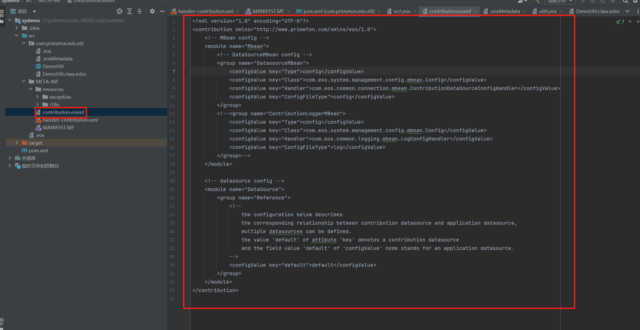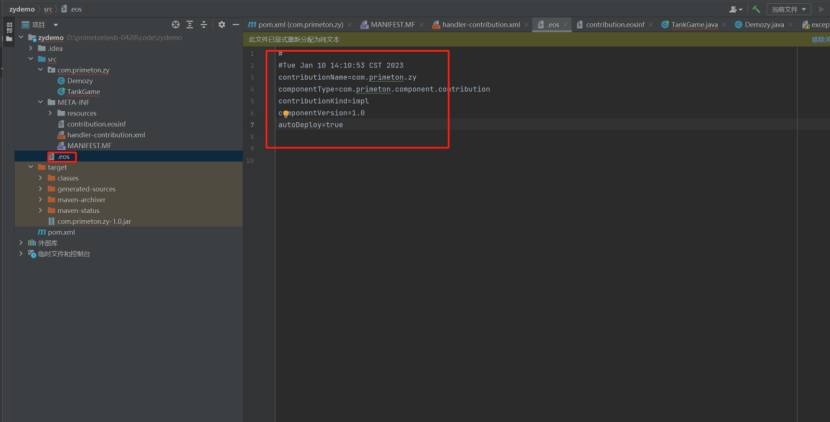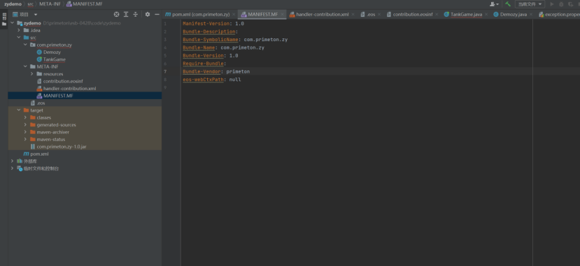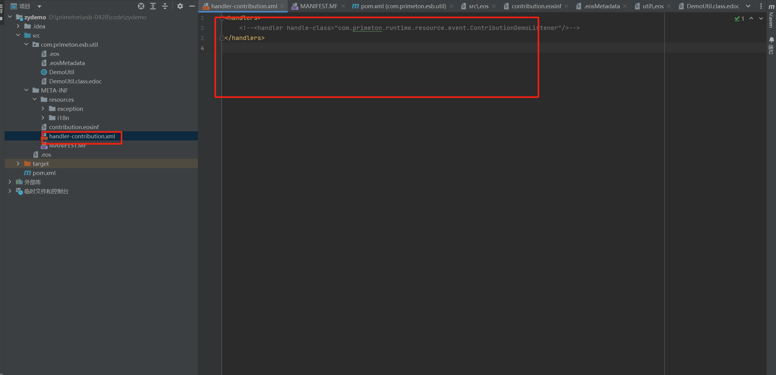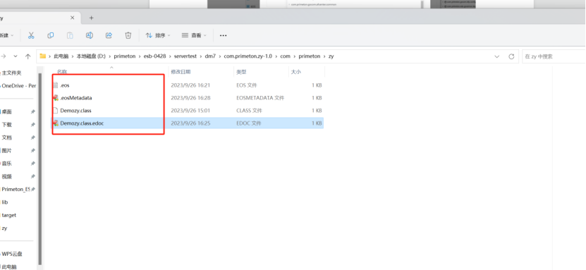 1. 在类对应的同级目录需要添加.eos、.eosMetadata、Demozy.class.edoc文件,控制资源中对应类的方法显示,如果方法名称要显示出来,需要在pom添加打包方法形参参数名称不变的配置,否则就会显示arg0、arg1等;