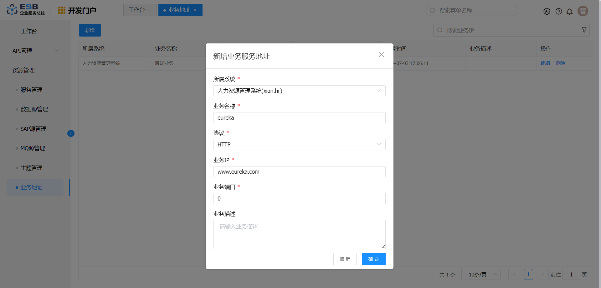 例如:在资源配置-业务地址管理中创建http业务服务地址,在新增业务服务地址时,业务服务地址中ip地址为原服务在eureka注册中心注册的服务名,端口号为“0”。