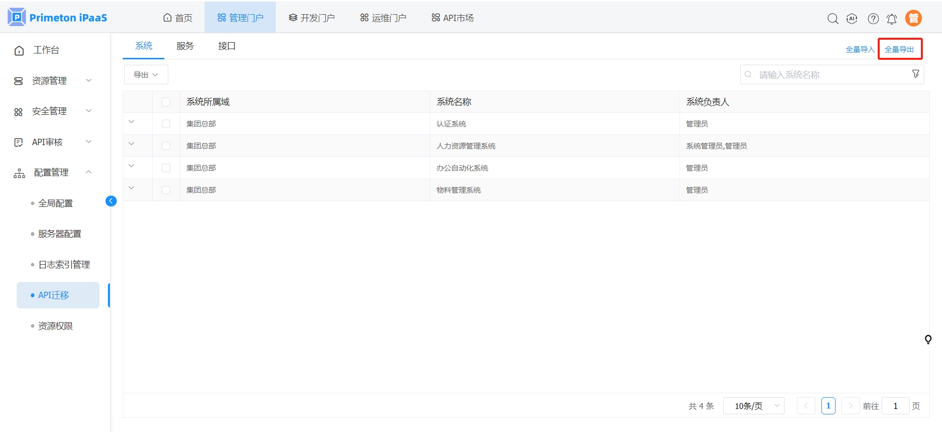 使用manager账号登录测试环境,点击“管理门户->配置管理->API迁移”,进入API迁移页面,在右上角点击“全量导出”按钮,弹出修改资源环境配置页面。