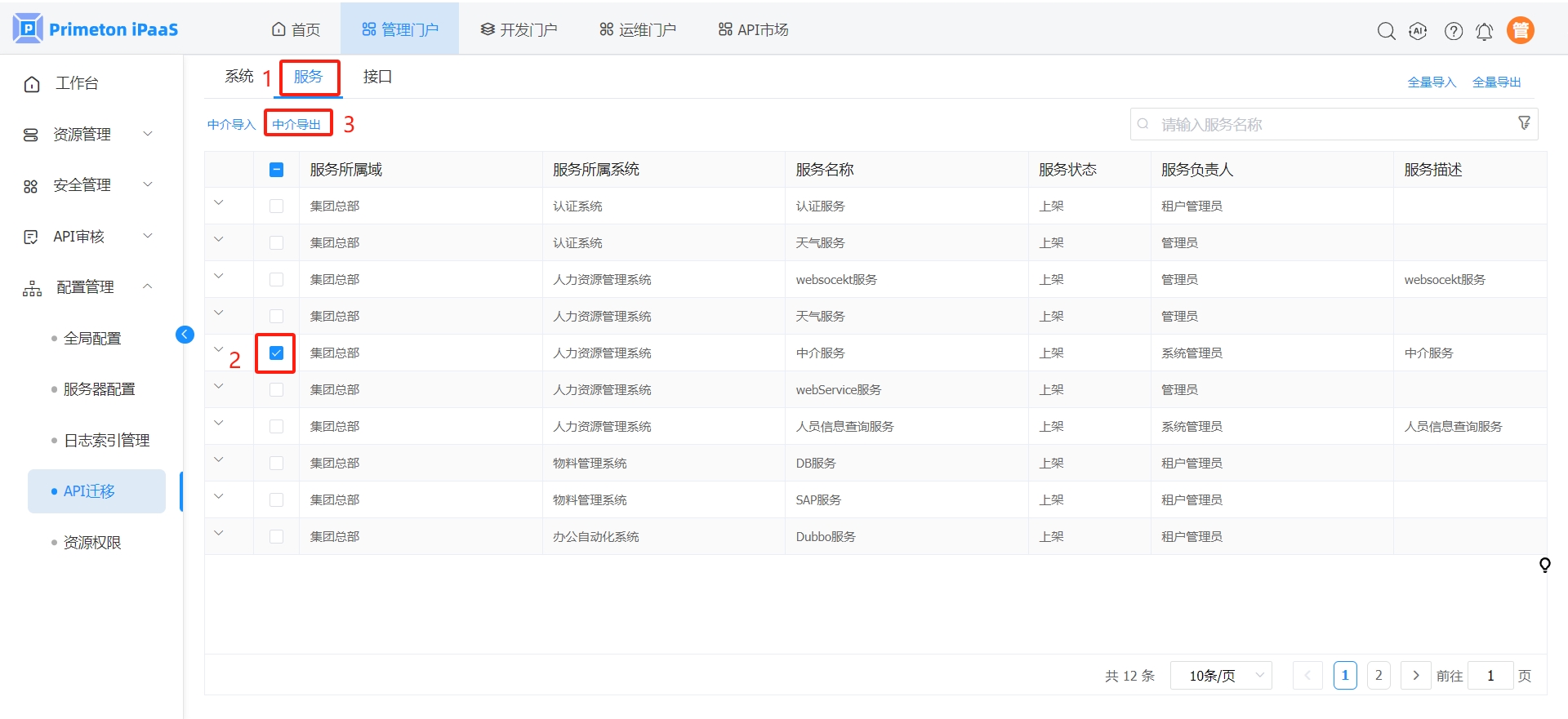 使用manager账号登录测试环境,点击“管理门户->配置管理->API迁移”,进入API迁移页面,点击服务页签,在服务列表勾选要导出的中介服务(只要服务下存在API编排接口就是中介服务,没有API编排接口的服务无法使用中介迁移),点击“中介导出”按钮,弹出修改资源环境配置页面。