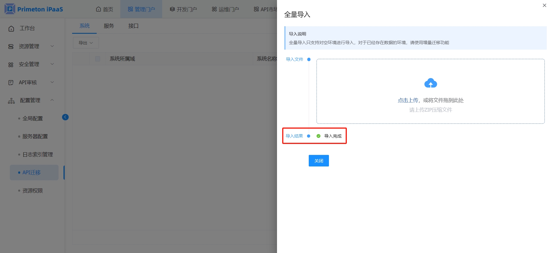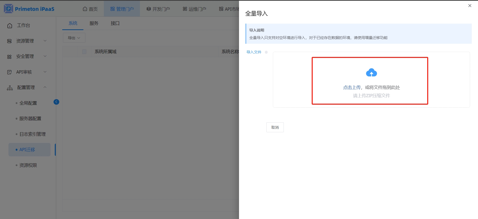 使用manager账号登录生产环境,点击“管理门户->配置管理->API迁移”,进入API迁移页面,在右上角点击“全量导入”按钮,弹出全量导入页面。